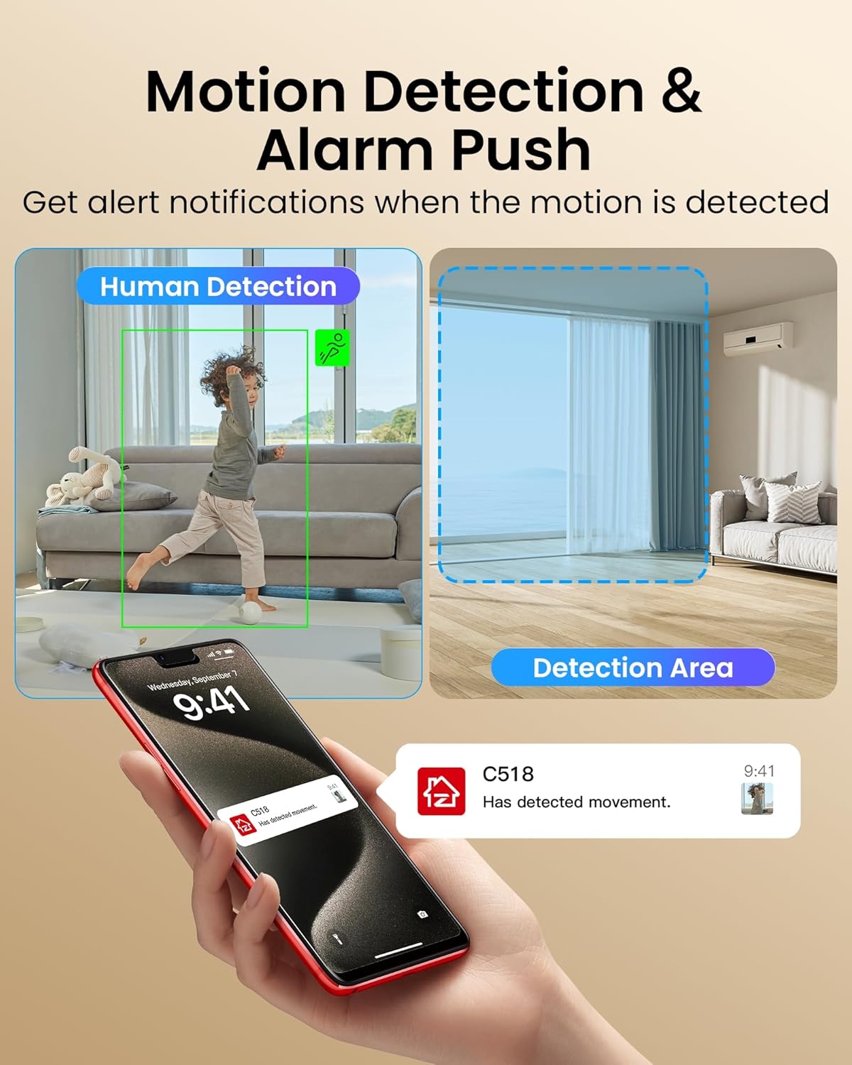 Die Überwachungskamera bietet eine zuverlässige Lösung für die Sicherheit im Innenbereich. Sie ist in einer weissen Kuppelform gestaltet und besteht aus robustem Kunststoff, was sie besonders langlebig macht. Durch die selbstklebende Montageart lässt sie sich mühelos installieren. Sie unterstützt sowohl 2,4GHz als auch 5GHz WiFi, was eine flexible Integration in das bestehende Netzwerk ermöglicht. Ein Bewegungssensor sorgt dafür, dass bei erkannter Bewegung sofort Benachrichtigungen gesendet werden. Für die Nachtsicht ist eine Reichweite von bis zu 10 Meter gewährleistet, wodurch auch bei Dunkelheit klare Aufnahmen gemacht werden können. Die Kamera ist kabelgebunden und verfügt über eine One-Touch-Anruftaste sowie eine 2-Wege-Audiofunktion, die es ermöglicht, mit Personen im überwachten Bereich zu kommunizieren. Sie ist mit Amazon Alexa kompatibel, was eine einfache Sprachsteuerung ermöglicht.