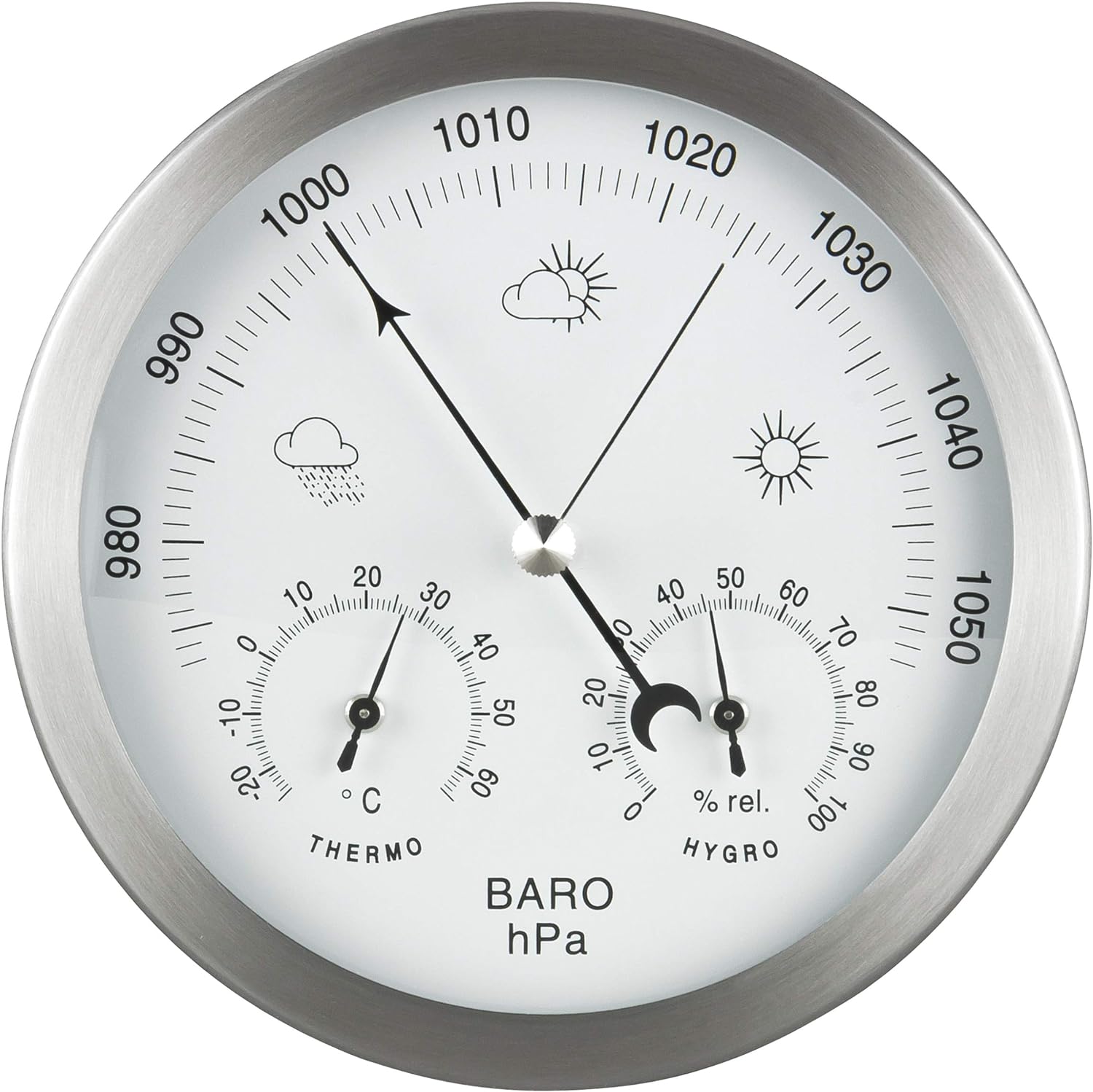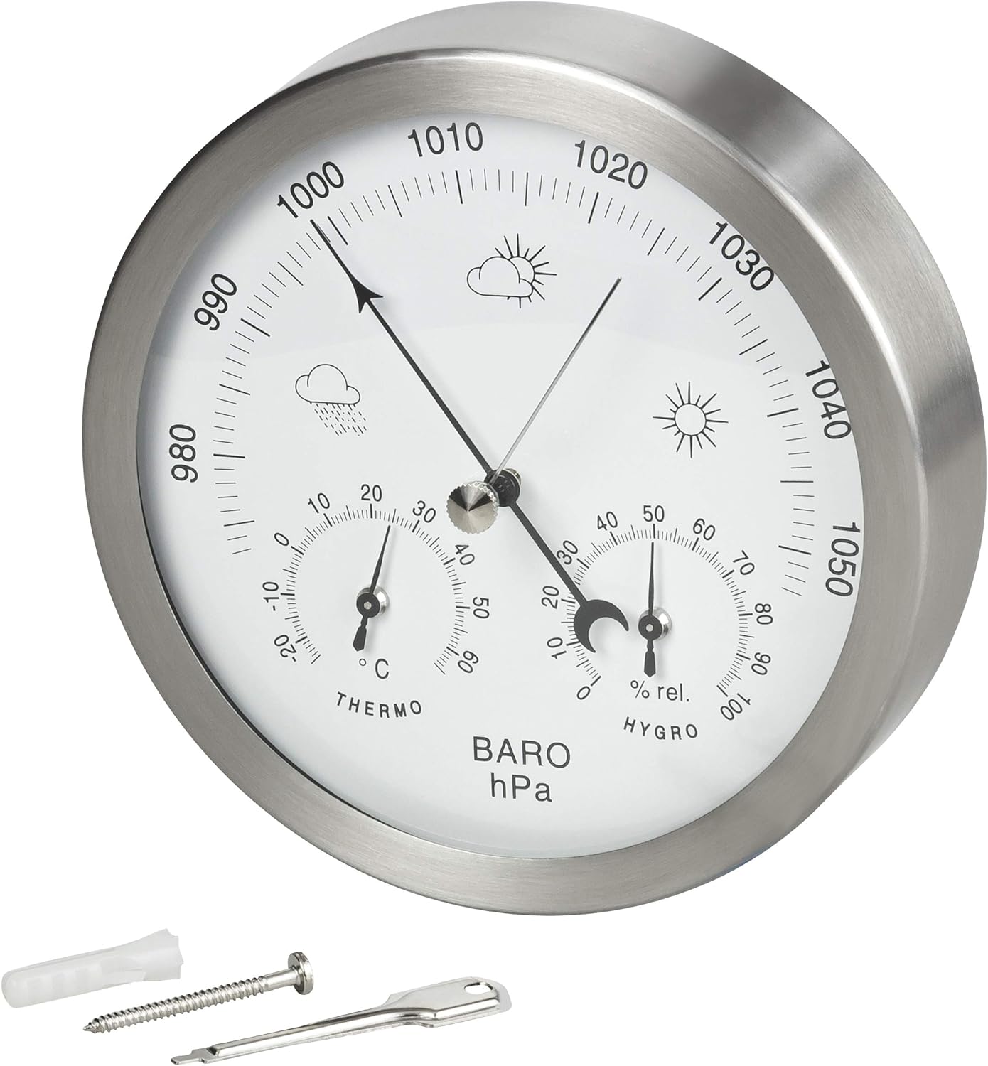 Im Einklang mit der Ästhetik klassischer Messinstrumente verbindet die GardenMate Wetterstation analog 3in1 mit robustem Edelstahlrahmen Funktionalität und Stil. Eine präzise Messung klimatischer Bedingungen ist durch das integrierte Barometer, Thermometer und Hygrometer garantiert, welche Temperaturbereiche von -25 bis 65° C, Luftfeuchtigkeit von 0 bis 100 % RH und einen barometrischen Druck von 960 bis 1060 hPa abbilden. Mit einem Durchmesser von 14 cm und einer Tiefe von 4 cm sowie einer batteriefreien analogen Funktionsweise trägt dieses Messinstrument zu einer zuverlässigen Raum- und Aussenklimaüberwachung bei. Die Rückseite aus stabilem Kunststoff, der mitgelieferte Stellschlüssel, die Gebrauchsanleitung sowie das notwendige Befestigungsmaterial sorgen für eine unkomplizierte Installation.