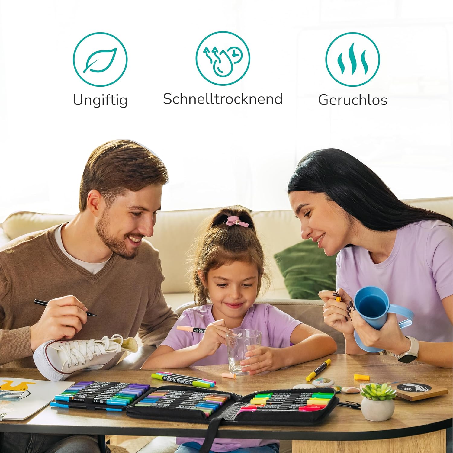 Die Acrylstifte mit Doppelspitze eignen sich für kreative Arbeiten wie Basteln, Malen und Handarbeiten. Die Stifte sind in einer bunten Farbpalette erhältlich und für die Verwendung auf Steinen, Papier, Leinwand und Holz geeignet. Sie sind mit einer feinen Spitze und einer Pinselspitze ausgestattet, sodass sowohl feine Details als auch umfassendere Flächen gestaltet werden können. Die Farben sind wasserfest, trocknen schnell und sind lichtbeständig, was zur langen Haltbarkeit der Kunstwerke beiträgt. Der ergonomische Griff der Stifte ermöglicht eine komfortable Handhabung. Im Lieferumfang sind 48 Acrylstifte und eine praktische Tasche enthalten.