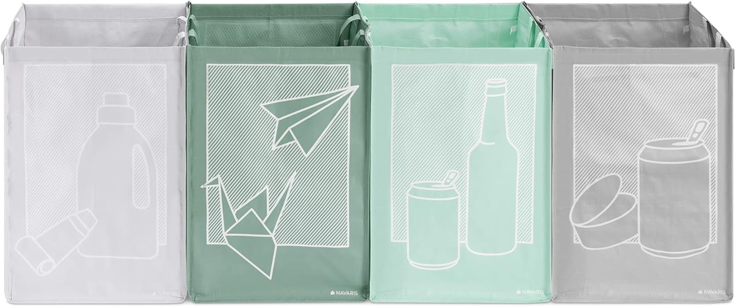 Das Navaris 4er-Set Recycling Taschen bietet eine ästhetische und nachhaltige Lösung für die Mülltrennung im Alltag. Bestehend aus vier Taschen in einem ansprechenden und lebendigen Design, eignen sie sich hervorragend für die Sortierung von Papier, Glas, Metall und Wertstoffen, die in der gelben Tonne entsorgt werden. Jede Tasche misst 30 x 30 x 43 cm und ist aus gewebtem Polypropylen gefertigt, was sie sowohl reissfest als auch wasserdicht macht. Mit soliden Tragegriffen und einem praktischen Klettverschluss sind die Behälter nicht nur robust, sondern ermöglichen auch einen einfachen Transport.