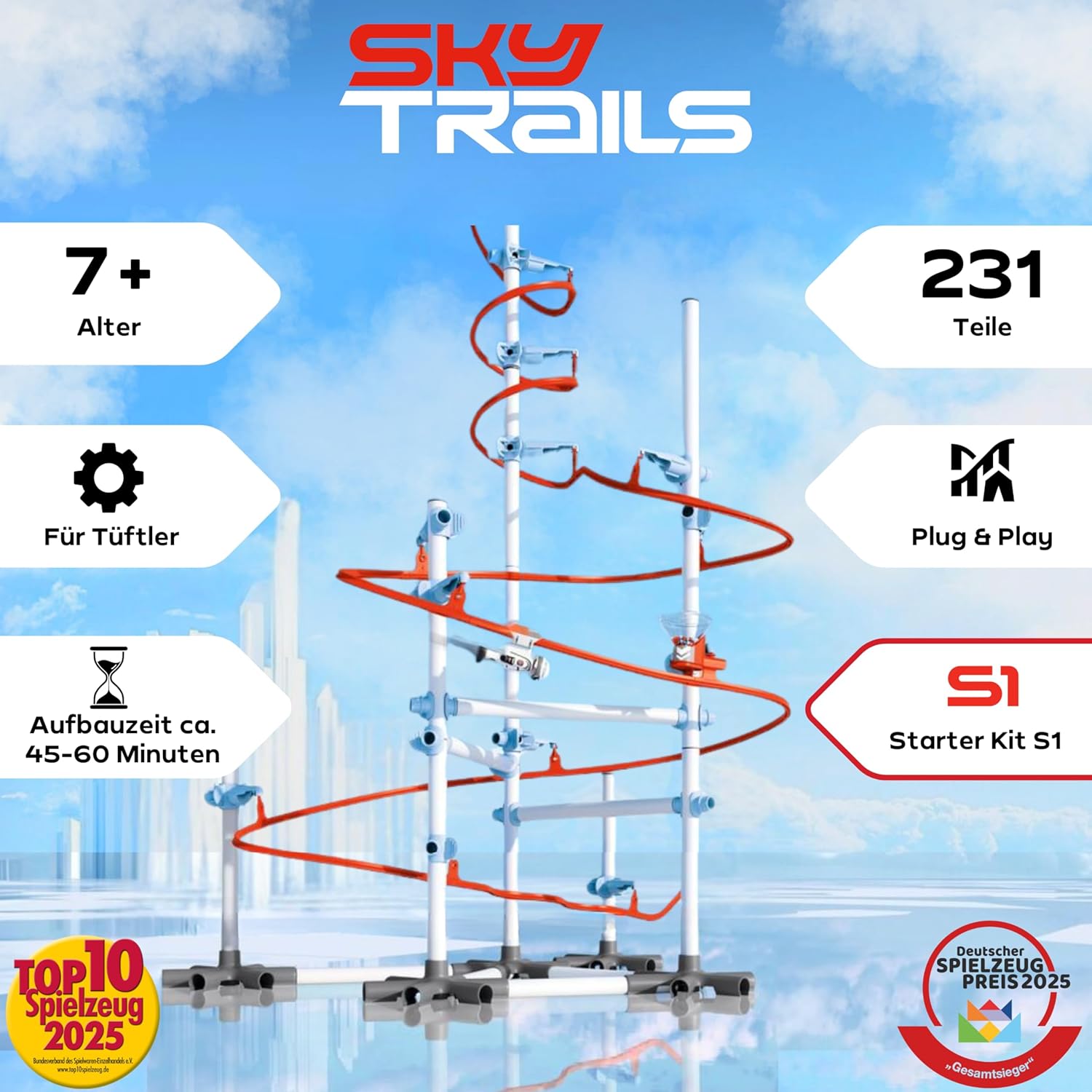 Achtung, Baumeister und Action-Helden! Mit Sky Trails machst du dein Zuhause zum ultimativen Action-Spielplatz und baust aufregende Strecken für dich und deinen Sky Rider! Egal, ob hoch, breit, verrückt verschlungen oder rasant steil – es liegt in deiner Hand! Baue deine Bahn vom Fensterbrett über den Tisch bis zu deinem Bett, mit wilden Abfahrten, rasanten Kurven, Loopings und vielem mehr! Dank des einfachen Plug-and-Play-Systems kannst du immer neue Strecken erschaffen und deinen Rider spektakulär durch die Bahn sliden lassen. Das Starter-Set enthält alles, um sofort loszulegen – und wenn du noch mehr willst, kannst du dein Set mit vielen coolen Erweiterungen ausbauen. Deiner Fantasie sind keine Grenzen gesetzt!