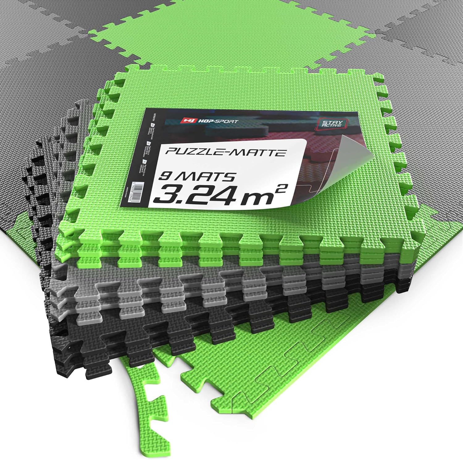 Die Puzzlematte in den Farben Schwarz, Grau, Grün eignet sich für den Einsatz im Fitnessbereich. Hergestellt aus strapazierfähigem ABS-Material, verfügt sie über eine rutschfeste Oberfläche, die sicheren Halt während des Trainings bietet. Die Matte kann zur Reinigung einfach mit einem feuchten Tuch abgewischt werden. Der Lieferumfang umfasst 9 Matten (60 x 60 x 1 cm) sowie passende Randstücke, die eine Anpassung an verschiedene Raumgrössen ermöglichen.