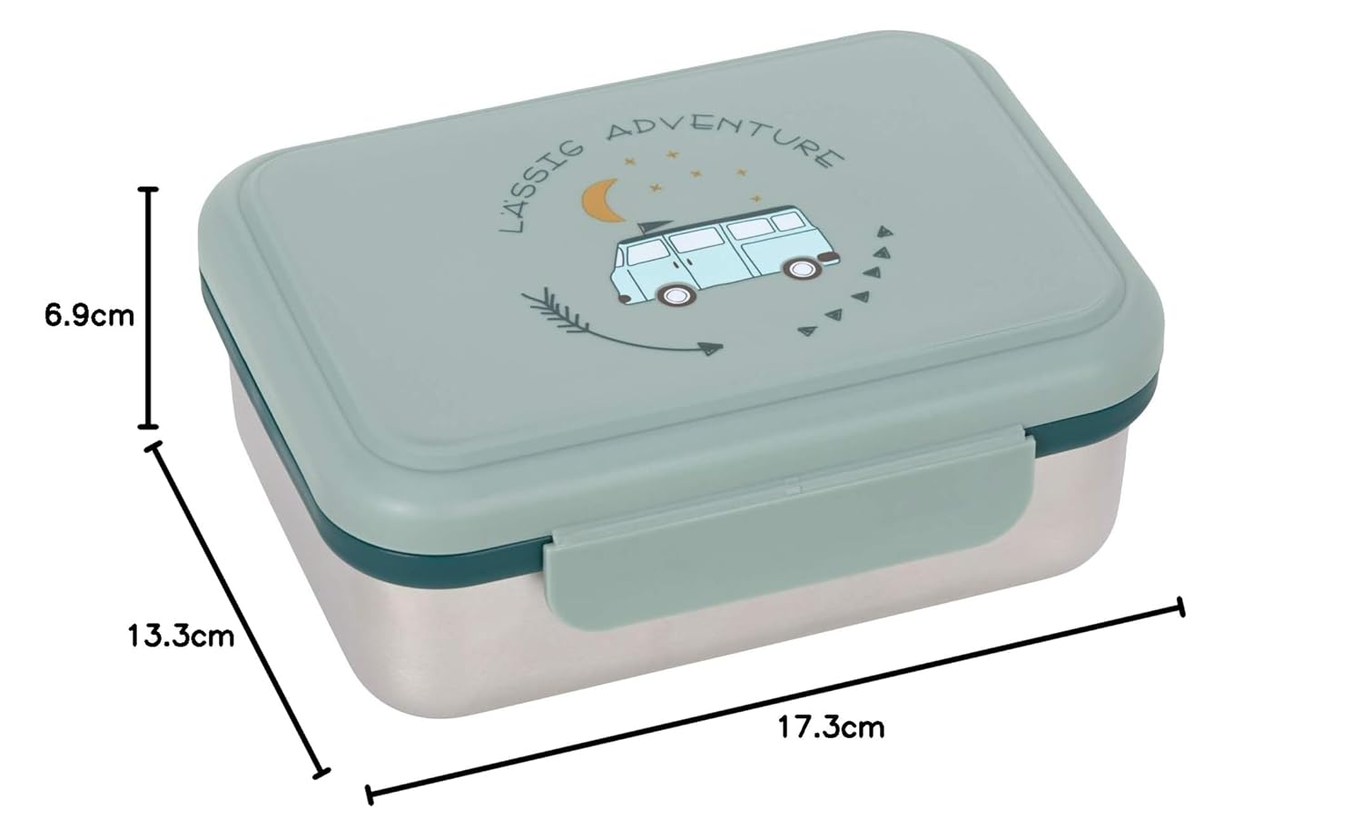 Auf ins nächste Abenteuer. Mit der Edelstahl Brotdose für Kinder aus der Lässig Kinderkollektion Adventure sind hungrige Abenteurerinnen und Weltentdecker bestens ausgerüstet. Die robuste und BPA-freie Brotdose besteht aus geruchs- und geschmacksneutralem Material: Die Box besteht aus 100 % Edelstahl und der Deckel aus 100 % Polypropylen. Durch den im Deckel integrierten Silikonring ist die Brotdose gut verschlossen und die Brotzeit bleibt frisch und lecker. Praktische Details, wie die flexibel einsetzbare Trennung, ermöglichen es, verschiedene Snacks in einer Dose aufzubewahren. Die Brotdose im trendigen Adventure Design in den Farben Altrosa mit einem Tipi oder Blau mit einem Bus kann einfach in der Spülmaschine gereinigt werden.