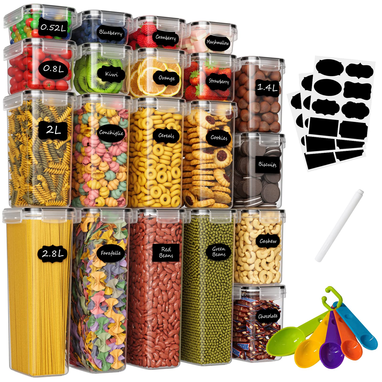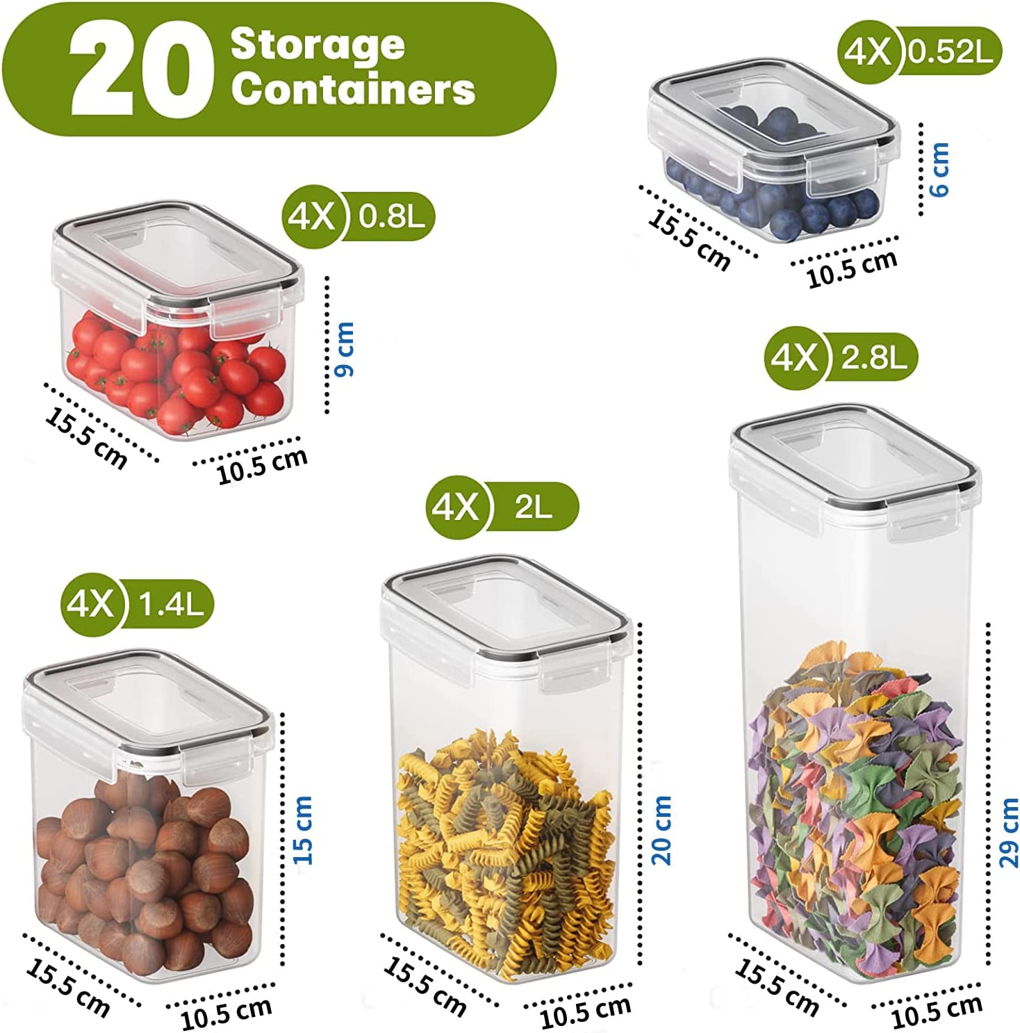 Dieses Aufbewahrungsset enthält 20 stapelbare Dosen, um Lebensmittel wie Nudeln, Süssigkeiten, Obst oder Gemüse zu lagern. Die Boxen haben unterschiedliche Grössen: 2.8L (4 Stück), 2.0L (4 Stück), 1.4L (4 Stück), 0.8L (4 Stück) und 0.52L (4 Stück). Ausserdem sind in dem Set 24 Etiketten zur Kennzeichnung der Boxen, 1 Stift und 5 Messlöffel enthalten. Jede Vorratsdose ist aus hochwertigem ABS-Kunststoff in Lebensmittelqualität gefertigt und verfügt über eine hohe Schlagfestigkeit. Das Material ist BPA-frei und ungiftig. Die Vorratsdosen sind nicht nur luftdicht verschliessbar, sondern auch mikrowellengeeignet und spülmaschinenfest.