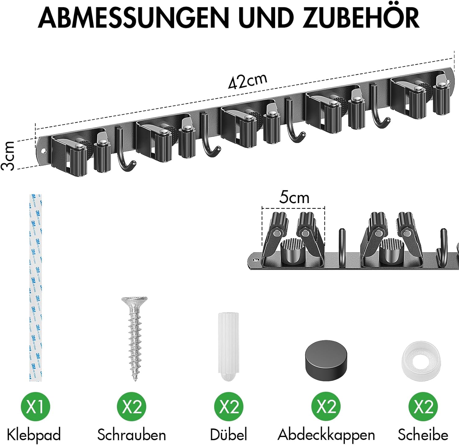Die Besenhalterung ist aus robustem Edelstahl gefertigt und verfügt über eine pulverbeschichtete Oberfläche. Sie eignet sich ideal zur Wandmontage in Garten, Küche und Bad. Die Halterung bietet Platz für Besen, Wischmopps, Schrubber sowie leichte Gartengeräte und kann pro Haken oder Halter bis zu 3 kg tragen. Im Lieferumfang sind ein Besenhalter mit fünf Haltern und vier Haken, ein Klebepad, zwei Schrauben, zwei Dübel sowie zwei Abdeckkappen enthalten.