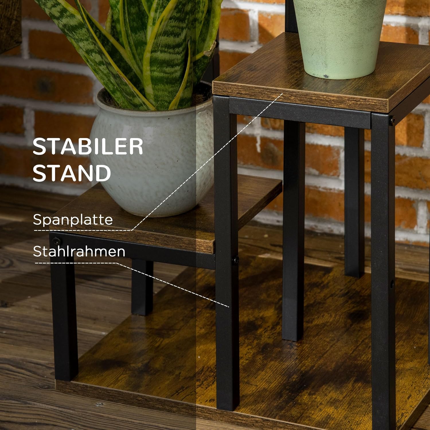 Der Outsunny Pflanzenständer präsentiert sich als stilvolles, mehrstöckiges Blumenregal in einem ansprechenden Braunton. Mit Massen von 40L x 40B x 81H cm bietet das multifunktionale Pflanzenregal vier Ebenen zur optimalen Präsentation von bis zu 20 kg schweren Gegenständen pro Regalboden. Ob in der heimischen Grünanlage oder auf dem balkonischen Refugium, es hält Gartenaccessoires, Topfpflanzen und Kerzen gleichermassen stilvoll und sicher. Der platzsparende, vertikale Aufbau maximiert den Grünbestand auf kleinster Fläche, während der robuste Stahlrahmen Beständigkeit und Stabilität gewährleistet. In Innenräumen wandelt sich dieses vielseitige Regal zu einer Bühne für Bücher, Fotos und Sammlerstücke.
