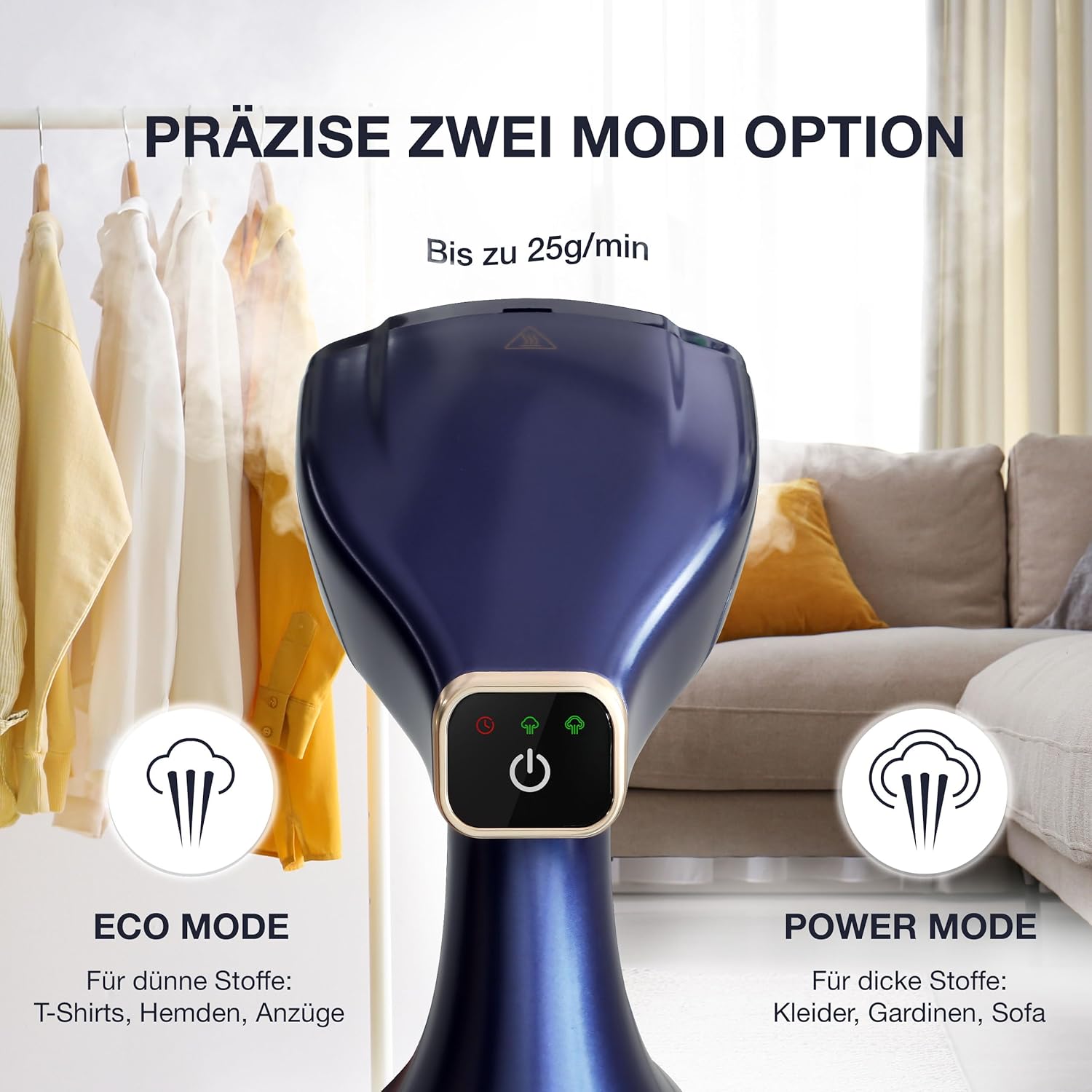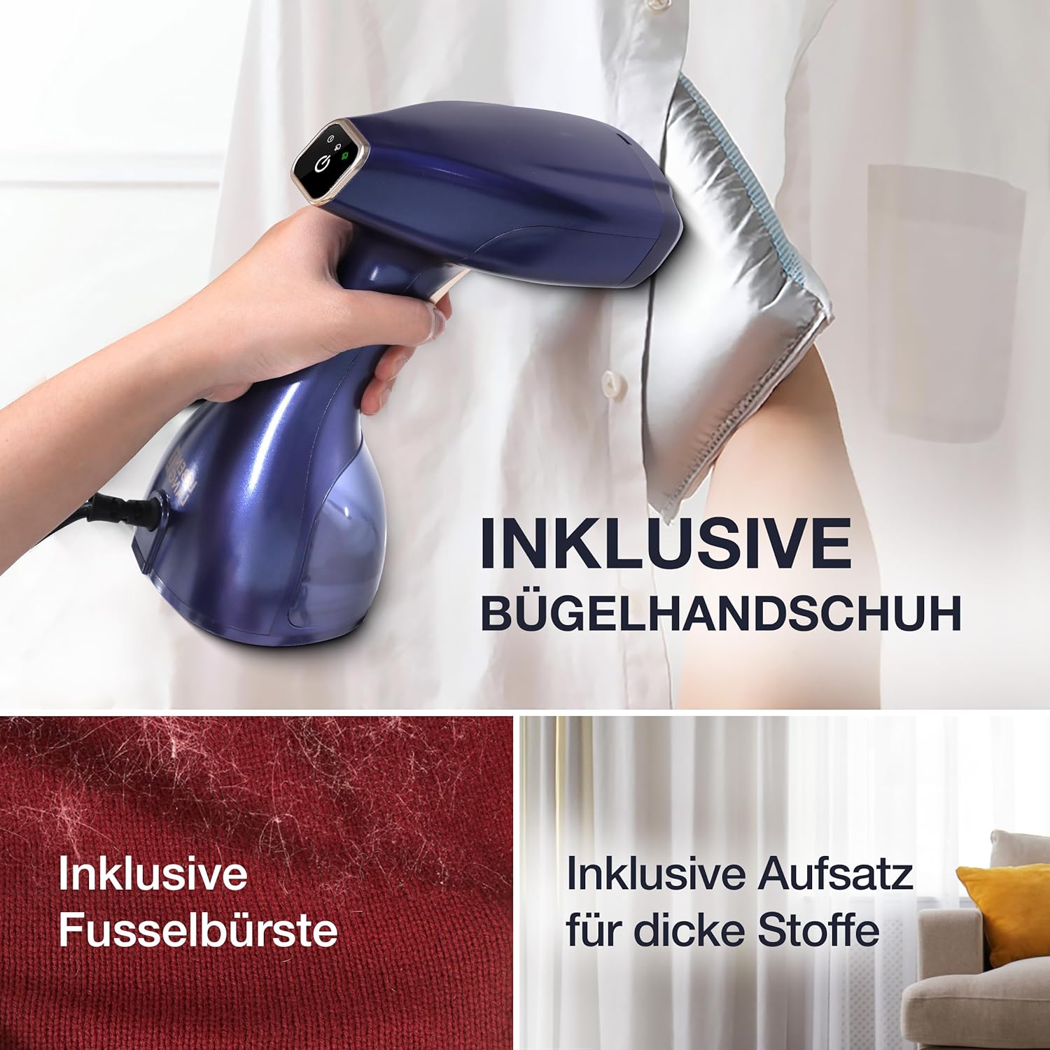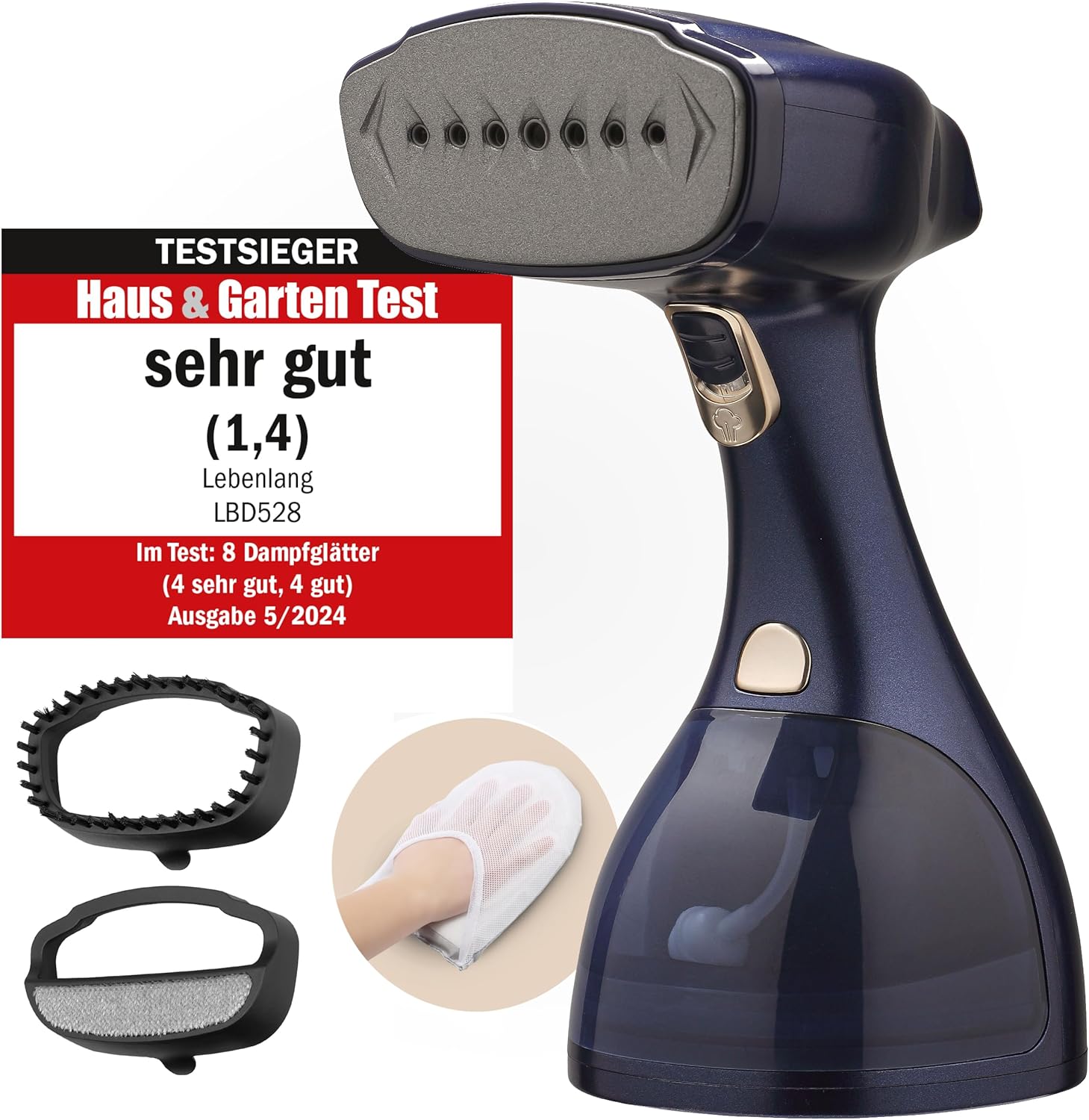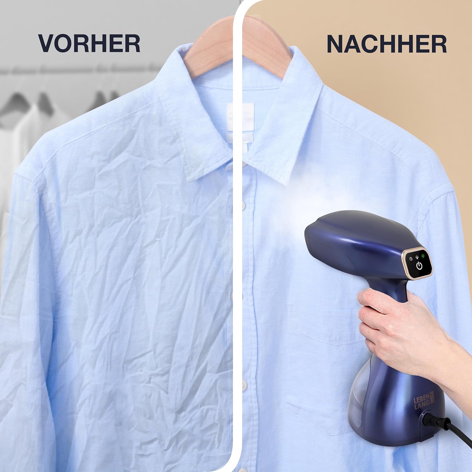 Der LEBENLANG Dampfglätter (1500 Watt) ist mit einem Wassertankvolumen von 300 ml ausgestattet. Er kann Kleidung horizontal und vertikal bis zu 15 Minuten lang bügeln. Dabei sind Ergebnisse in unter 40 Sekunden erzielbar durch einen Dampfausstoss von bis zu 25g/min, was den Steamer besonders zeiteffizient macht. Das Handgerät bietet ein LCD-Display mit ECO & POWER Modus und lässt sich durch ein 2,5 m langes Stromkabel flexibel einsetzen. Neben einem praktischen Bügelhandschuh für glattere Ergebnisse sind zwei Aufsätze (Anti-Fussel, Multi Material) inkludiert. Zudem gewährleisten hochwertige Kunststoffdichtungen ein auslaufsicheres Dampferlebnis.