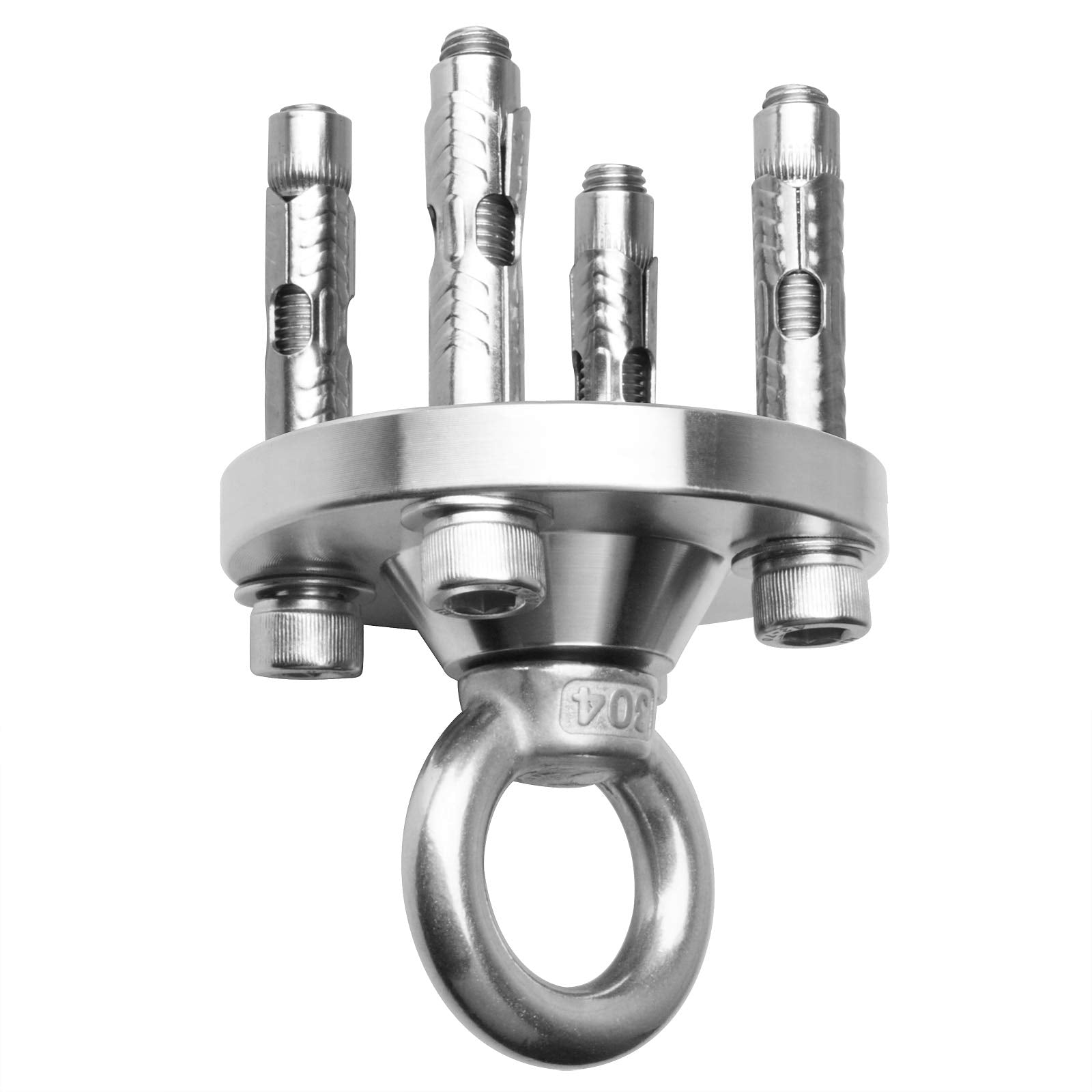 Mit diesem Deckenhaken können Auszieh- und Widerstands-Trainer, Spielplatzschaukeln, Innen-Aussenschwingen, Spielsets, Veranda-Schaukeln, Yoga-Trapez-Schaukeln, Gymnastik-Halterungen und Deckenlager befestigt werden. Der Ring lässt sich um 360° drehen. Der komplette Haken besteht aus Edelstahl mit polierter Oberfläche. Die Anbringung sollte nur an Betondecken erfolgen und nicht an Decken aus Gipskarton, Lehm oder anderen weichen Baustoffen. Bei korrekter Montage beträgt die Tragfähigkeit etwa 500 kg. Die Schrauben bzw. Ankerbolzen besitzen eine Länge von 7 cm und einen Durchmesser von 1.2 cm. Insgesamt ist das Produkt 9.2 x 9.2 x 7 cm gross und wiegt 1018 g.