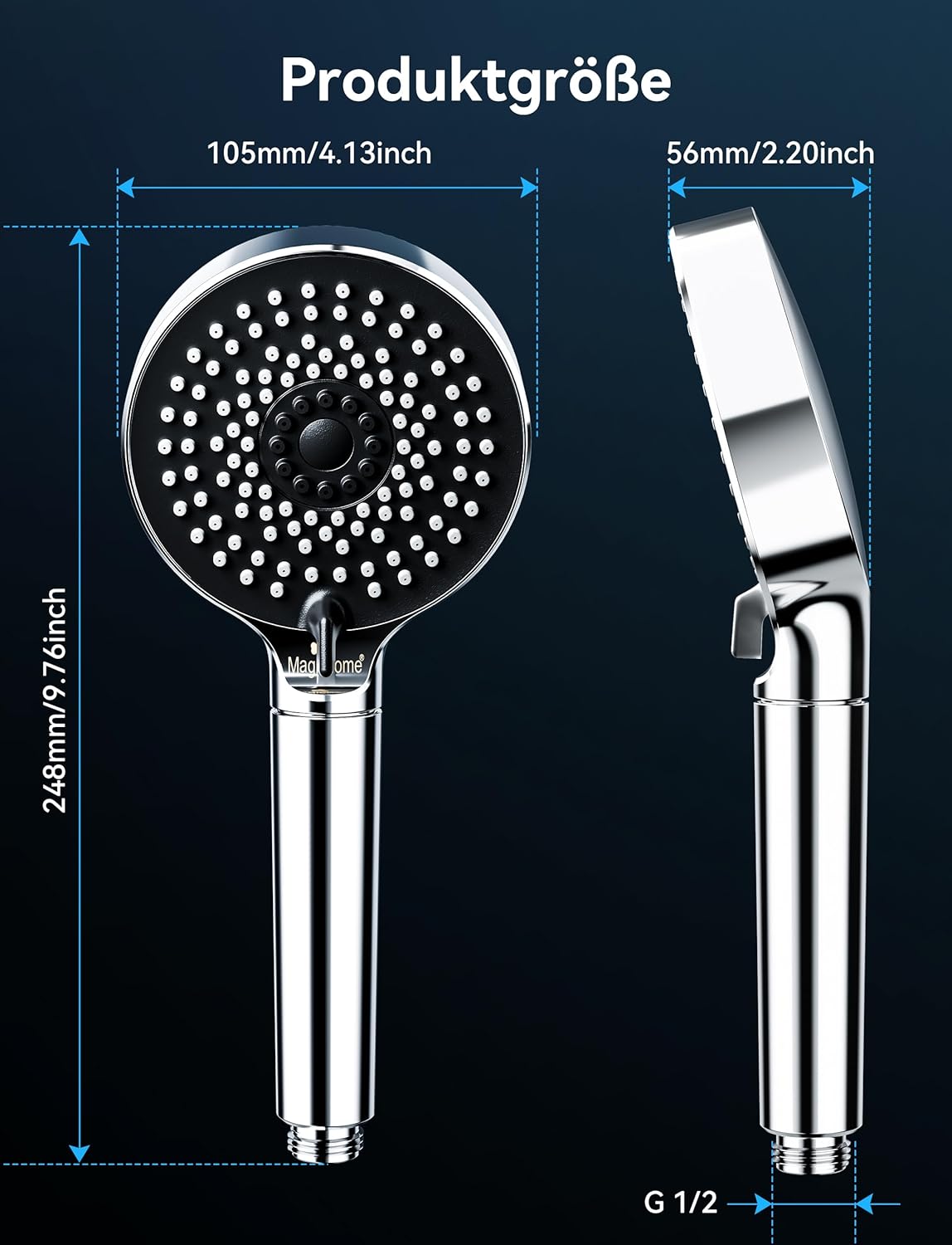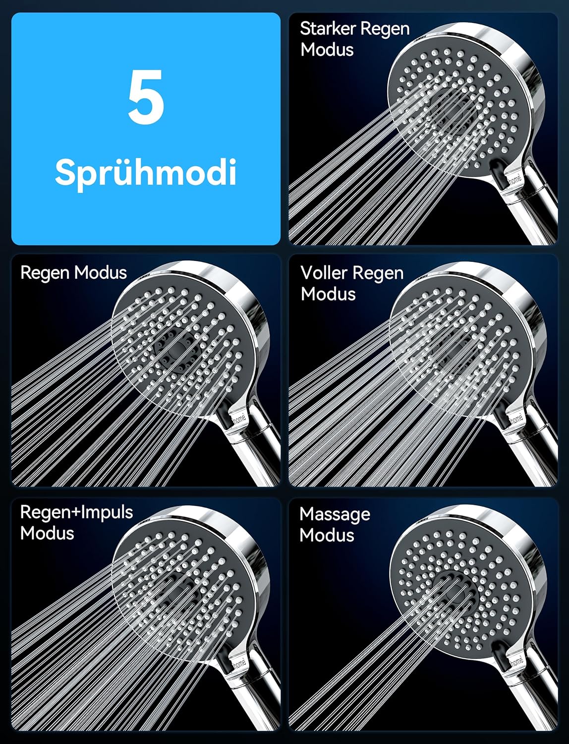 Der Magichome Duschkopf mit Schlauch setzt neue Massstäbe in puncto Wasserqualität und Duscherlebnis. Mit einem hoch entwickelten 20-Lagen Filtrationssystem ausgestattet, das KDF, Kalziumsulfit, Vitamin C und Mineralkugeln umfasst, gewährleistet dieser Duschkopf die Entfernung von Chlorrückständen, Schwermetallen und anderen Verunreinigungen. Die Antikalk-Silikondüse verhindert lästige Kalkablagerungen und erleichtert die Reinigung, während das patentierte Design mit der Luftdrucktechnologie den Wasserdruck für ein erfrischendes Regenerlebnis erhöht. Nutzer profitieren von fünf wählbaren Sprühmodi – für Flexibilität in jeder Situation, sei es die tägliche Haarwäsche oder das Reinigen des Badezimmers. Das Ganze präsentiert sich in einem schicken schwarzen Design, das in jeder modernen Badezimmerumgebung einen Akzent setzt.
