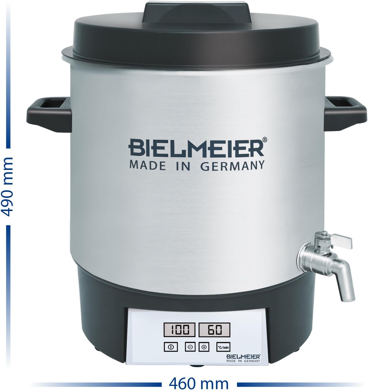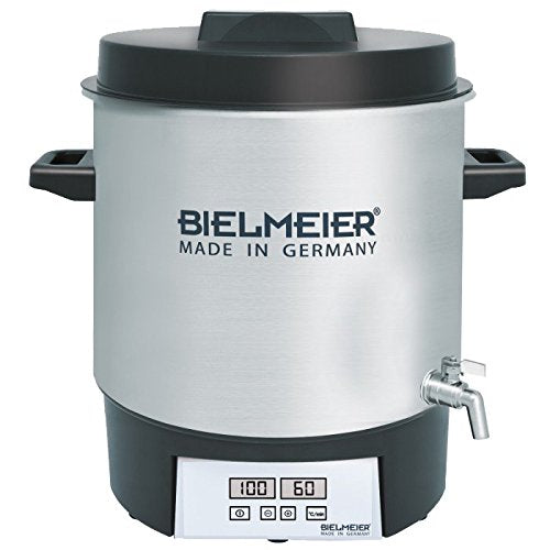 Dieser Einkochautomat besitzt eine Kapazität von 27 Liter und hat eine Leistung von 1800 Watt. Er eignet sich zum Einkochen und Sterilisieren von Obst und Gemüse. Ausgestattet ist der Automat mit einem 1/2'' Auslaufhahn, einer eingebauten Heizung und einem Deckel. Dank der digitalen Temperaturregelung können konstante Temperaturen eingestellt werden. Ausserdem ist das LED-Display des Geräts mit ergonomischen Drucktasten ausgestattet, welche zusätzlich zur Temperatureinstellung eine Zeiteinstellung ermöglichen. Der Einkochautomat besitzt zudem einen geschlossenen Boden, sodass auch Speisen in dem Automaten zubereitet werden können. Des Weiteren ist der Einkochautomat mit einem 120-Minuten-Timer mit Zeitrücklaufanzeige, einem Überhitzungs- und Trockengehschutz, einer Kabelaufwicklung im Unterboden sowie einem Topf aus gebürstetem Edelstahl ausgestattet. Die Höhe des Einkochautomats liegt bei 49 cm und der Durchmesser bei 46 cm.