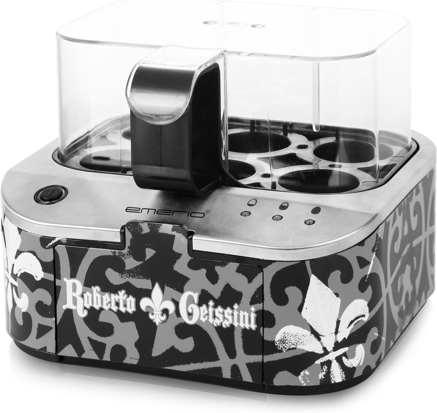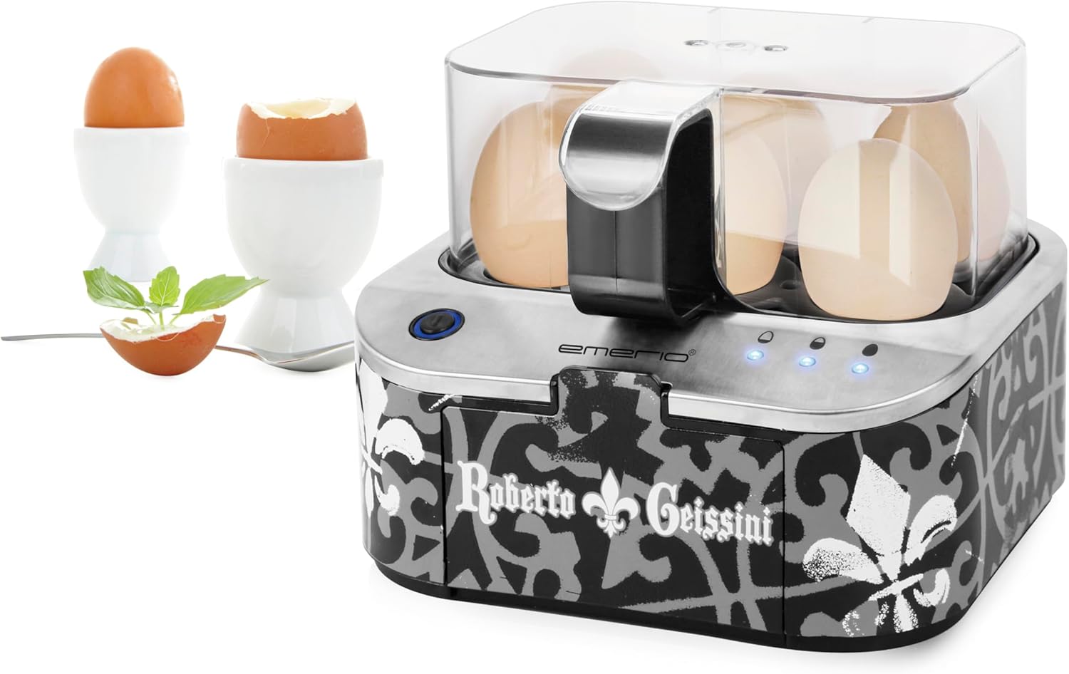 Der ROBERTO GEISSINI Eierkocher, entstanden in Kooperation mit dem trendigen TV-Format "Die Geissens", ist ein innovatives Küchengerät. Als Limited Edition, überzeugt dieser vollautomatische Eierkocher mit markanter Optik und einer herausragenden Funktionalität. Er kocht Eier in den Stufen weich, mittel und hart in einem Durchgang und gibt mittels der charismatischen Stimme von CARMEN GEISS eine Rückmeldung über den Garpunkt. Durchdacht ist auch das integrierte Staufach für Messbecher und Ei-Anstecher, was die Handhabung erleichtert. Alle Kunststoffteile sind BPA-frei. Ein Must-have für Fans von Glamour und perfekten Eiern.