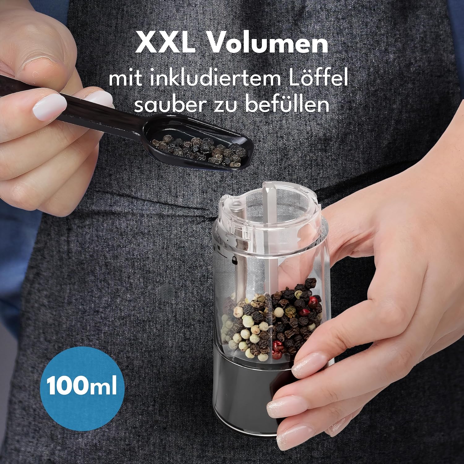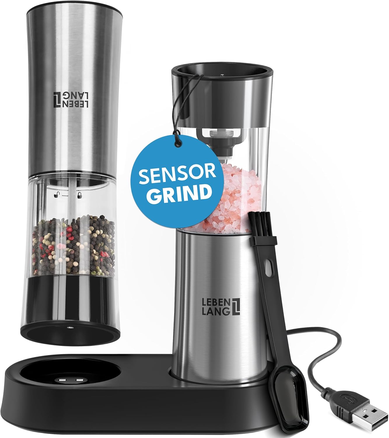 Das elektrische Salz- und Pfeffermühlen-Set in Schwarz und Silber überzeugt durch ein modernes Design und durchdachte Funktionalität. Das Gehäuse aus Edelstahl sorgt für Stabilität und eine hochwertige Haptik. Die Mühlen haben ein Fassungsvermögen von je 100 Millilitern und beginnen automatisch mit dem Mahlen, sobald sie gekippt werden (Kipp-Sensor-Funktion). Ein integrierter Lithium-Ionen-Akku ermöglicht den kabellosen Betrieb ohne Batteriewechsel. Eine LED-Leuchte an der Unterseite sorgt für bessere Sicht beim Dosieren. Zum Lieferumfang gehören eine abnehmbare Basisstation, ein USB-C-Kabel, ein Reinigungspinsel und ein Einfülllöffel. Diese Zubehörteile erleichtern die Befüllung und Reinigung.