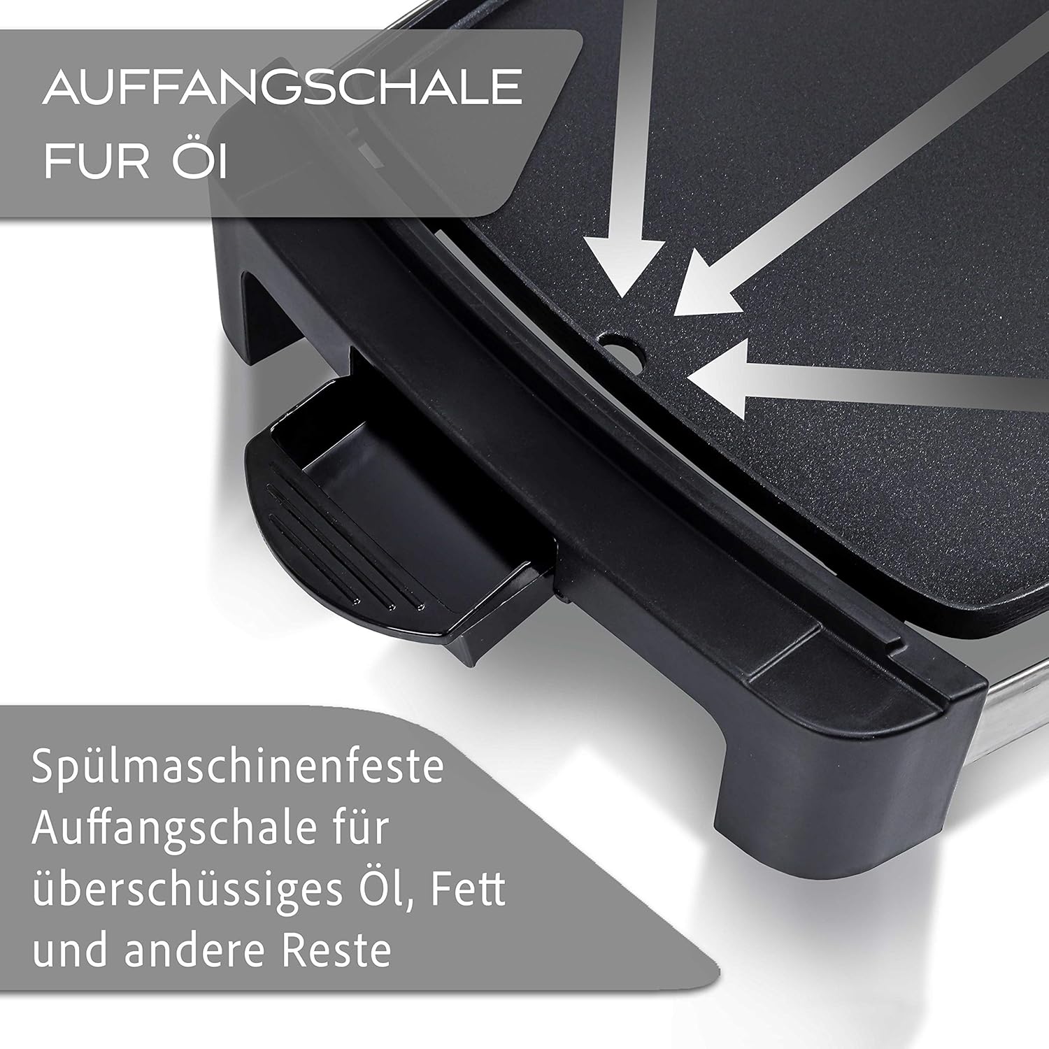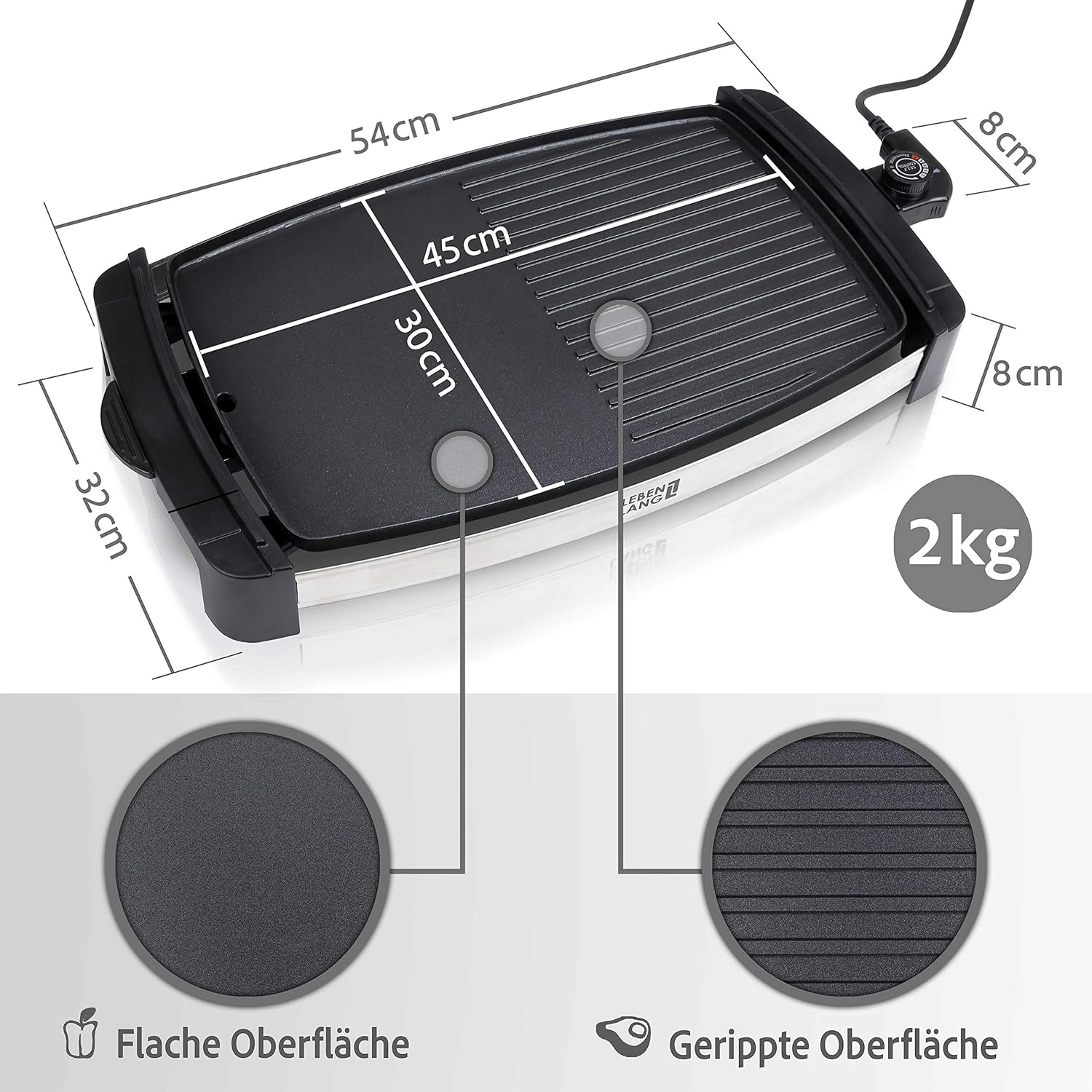 Der LEBENLANG Elektrogrill, konzipiert für 4 bis 8 Personen, ermöglicht mit seiner 2200 Watt Leistung und einer grosszügigen Grillfläche von 45 x 30 cm ein vielseitiges Grillerlebnis ohne Rauchentwicklung. Mit einer zweigeteilten Grillfläche – glatt für Gemüse und geriffelt für Fleisch – sowie einem präzisen Temperaturregler bis 230 Grad, passt sich dieser Grill den verschiedensten Speisen an. Die Antihaftbeschichtung und die herausnehmbare Auffangschale erleichtern die Reinigung.
