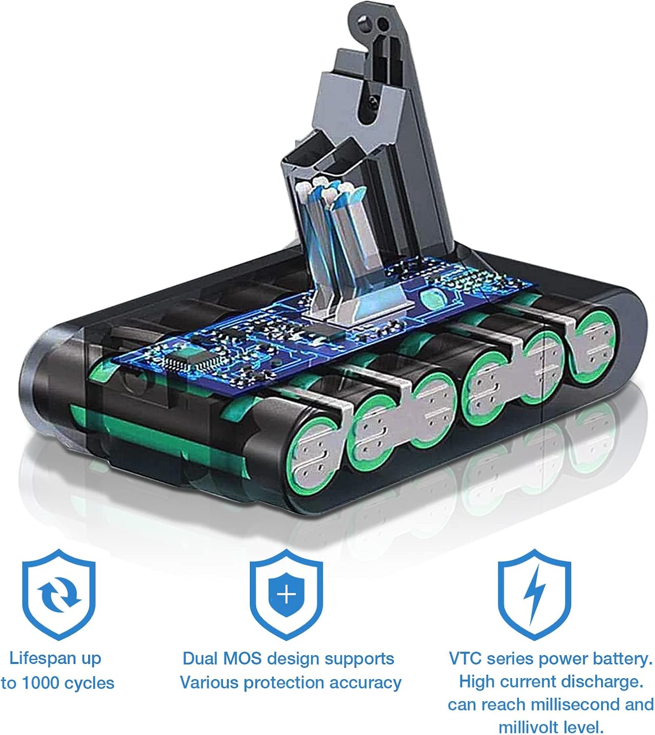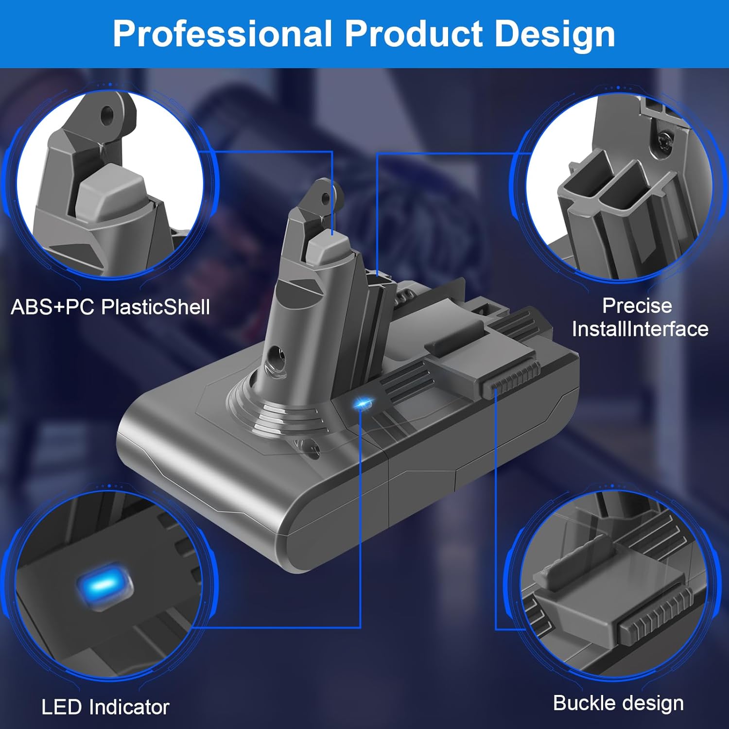 Der Ersatzakku für Staubsauger besteht aus robustem ABS-Material und ist mit einer Anti-Oxidations-Beschichtung versehen, um eine lange Lebensdauer zu ermöglichen. Der Akku ist ein Lithium-Ionen Akku mit einer Kapazität von 4500mAh und bietet hohen Energievorrat für eine ausdauernde Nutzung. Dieser Ersatzakku ist kompatibel mit einer Vielzahl von Dyson-Modellen, darunter V6 Animal, V6 Fluffy, V6 Flexi, V6 Slim, V6 Motorhead, V6 Absolute, V6 Trigger, V6 Standard, V6 Total Clean sowie den Modellen SV03, SV04, SV05, SV06, SV07, SV09, und den Serien DC58, DC59, DC61, DC62, DC72, DC74. Besondere Eigenschaften wie Überladungsschutz, Überentladungsschutz, Überstromschutz und Kurzschlussschutz sorgen für zusätzliche Sicherheit im Betrieb. Im Lieferumfang sind zwei Dyson Vorfilter enthalten.