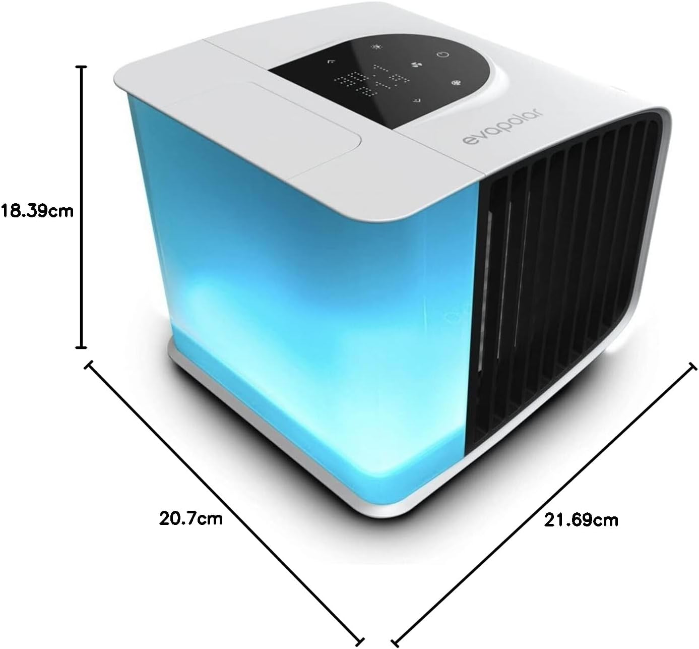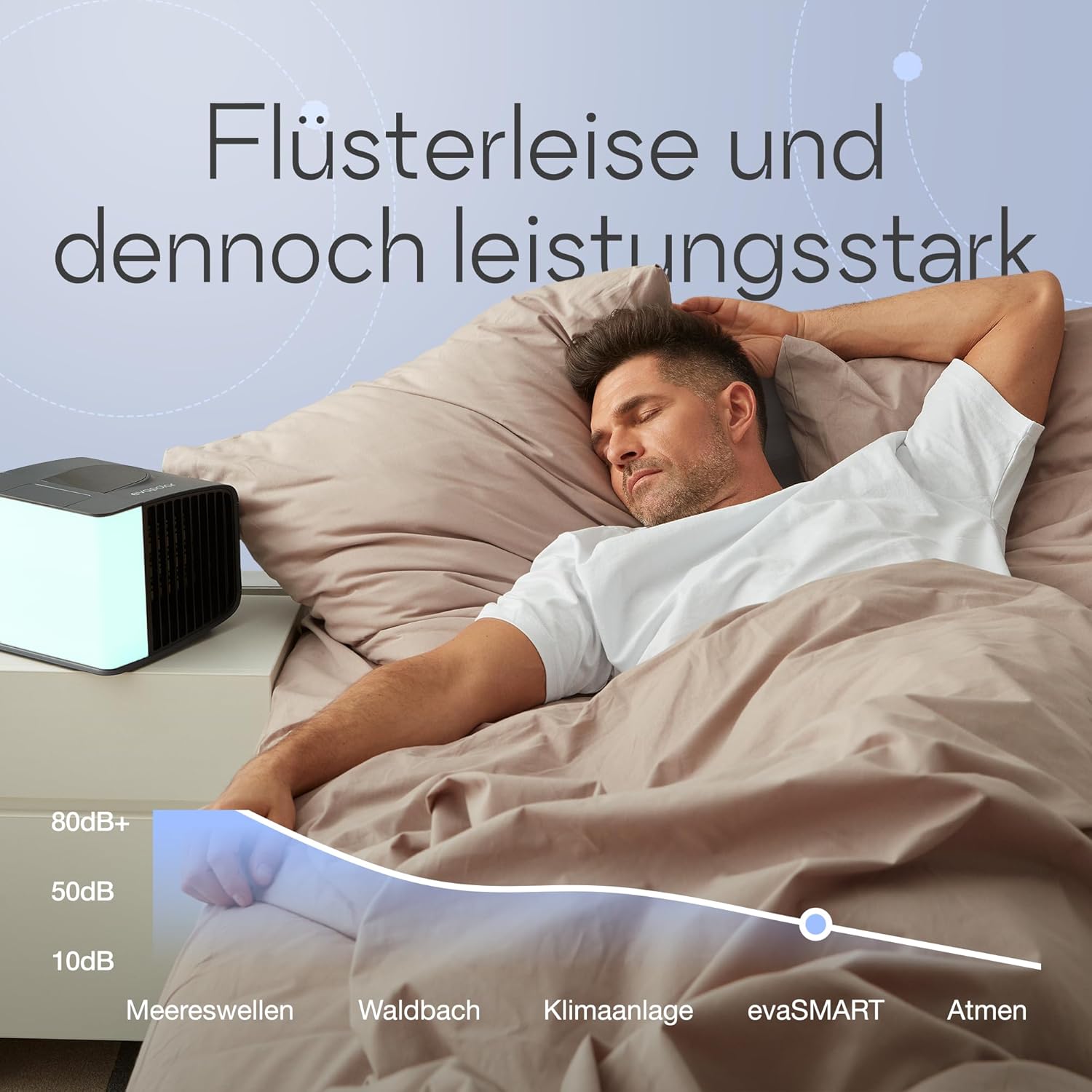 Der kompakte und formschöne Luftkühler lässt sich beinahe überall platzieren, wo Sie ihn mittels des mitgelieferten USB-Kabels mit Strom versorgen können. Er kühlt und befeuchtet eine Umgebung mit einer Grundfläche von ca. 4 m² und eignet sich beispielsweise sehr gut für Ihren Bürotisch, den Nachttisch, den Fitnessraum oder die Sofaecke im Wohnzimmer. Eine Tankfüllung reicht für sechs bis acht Stunden Betrieb, je nach herrschender Luftfeuchtigkeit und -temperatur. Am effizientesten arbeitet das Gerät in einer trockenen und mässig warmen bis warmen Umgebung, während es bei einer Luftfeuchtigkeit von mehr als 70 % sowie in sehr warmer bis heisser Umgebung nur noch eine sehr beschränkte Kühlwirkung bietet.