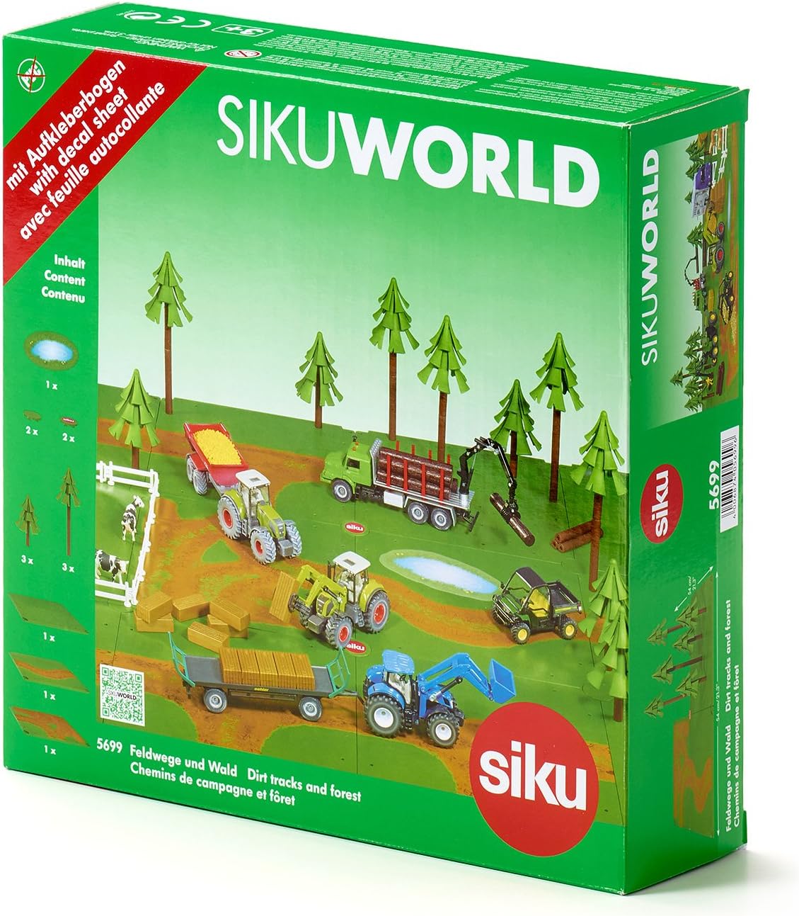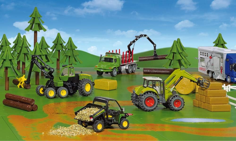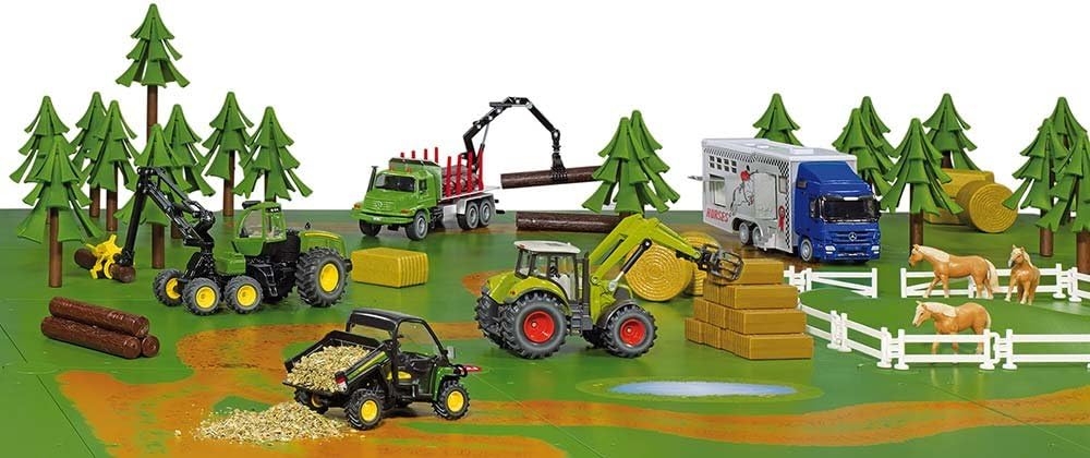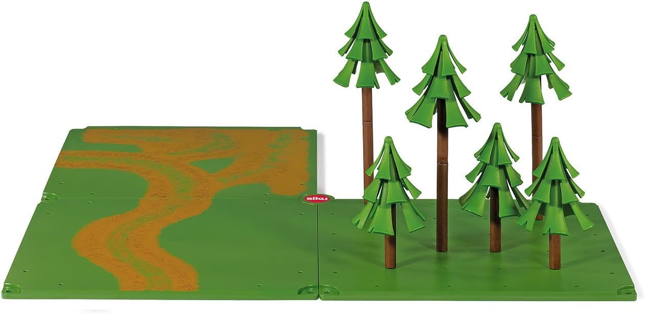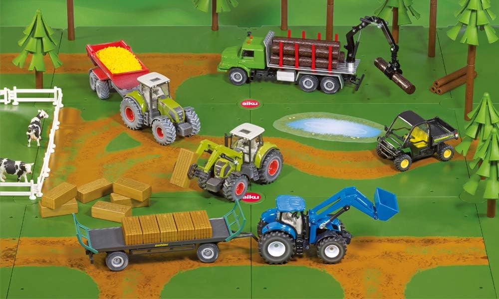 Die Platten beinhalten einen Feldweg mit Pfütze, eine Kurve mit Abstellbereich und eine Lochplatte mit Bäumen. Die Platten sind grün und fügen sich perfekt in den Farmbereich von Siku World ein.