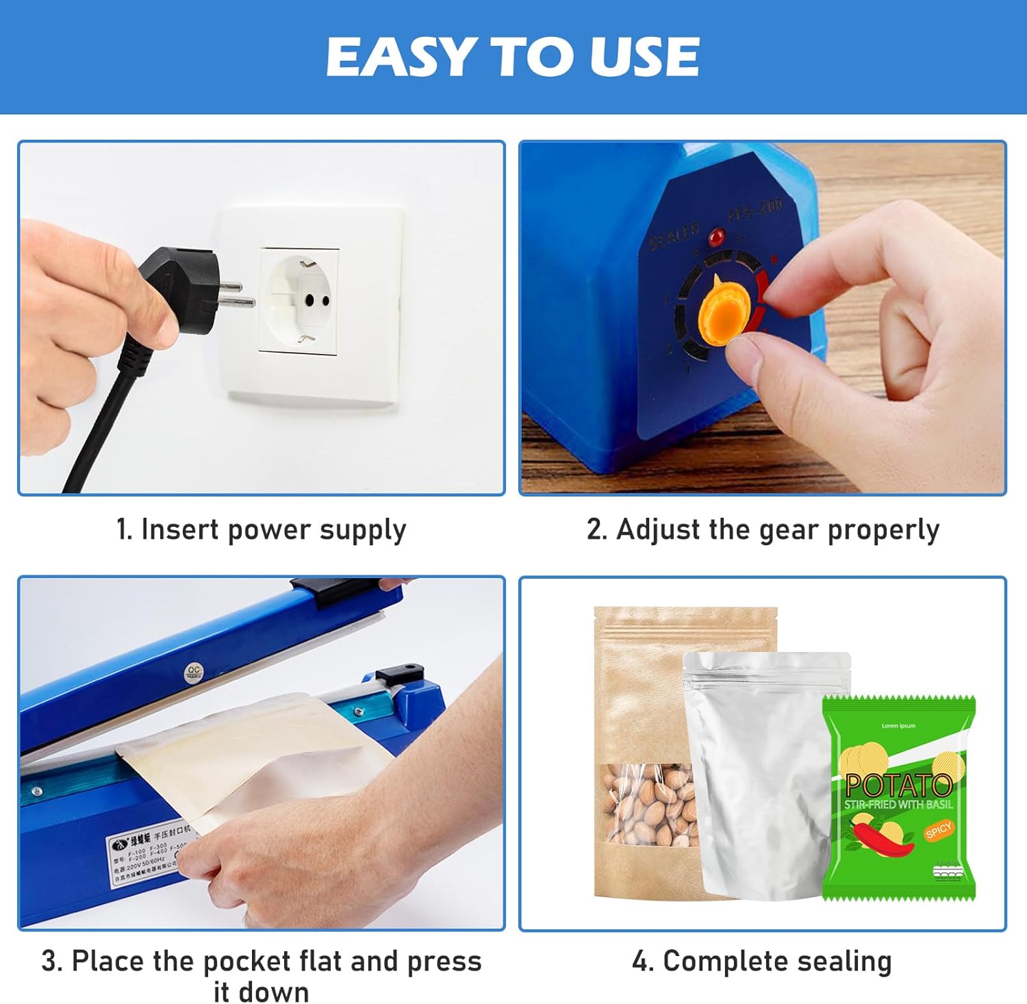 Das Vegena Folienschweissgerät zeichnet sich durch eine effiziente und einfache Handhabung aus. Mit einer Breite von 300 mm und einer 3 mm breiten Dichtung ist es für viele verschiedene Arten von Verpackungsmaterialien geeignet, darunter Plastiktüten, Alufolienbeutel und Kraftpapierbeutel. Besonders hervorzuheben ist die präzise 8-stufige Temperaturregelung, mit welcher sich die Wärme gezielt an die Dicke und das Material der Tasche anpassen lässt. Dies sorgt für ein optimales Versiegelungsergebnis, gleich ob es sich um die Einbindung von Nahrungsmitteln wie Schokolade, Brot oder Obst handelt. Zur Steuerung wird ein Timer eingesetzt, der die Versiegelungsdauer zwischen 1 und 3 Sekunden ermöglicht – eine schnelle und effektive Methode, um Zeit in den alltäglichen Verpackungsprozessen einzusparen. Das Gerät wird mit einer Spannung von 220V betrieben und bietet durch seine kompakte Grösse von L 40,2 x B 8 x H 11,5 cm eine handliche Lösung für den Haushalt und Einzelhandel. Auch bei der Sicherheit überzeugt das Folienschweissgerät, das die Stromversorgung automatisch nach der Versiegelung abschaltet und nur bei Betätigung des Griffs aktiviert wird.