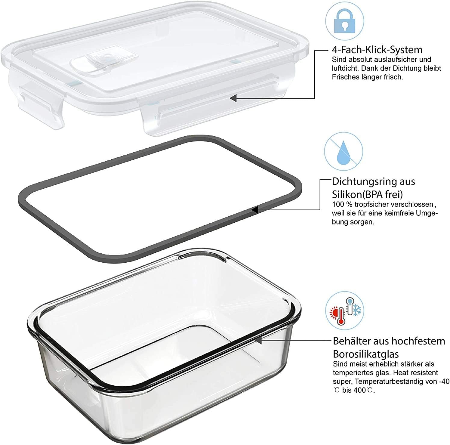 Dieses 5er-Set umfasst 5 Frischhaltedosen mit je 840 ml Volumen. Gefertigt aus robustem, BPA-freiem Borosilikatglas, sind die Dosen nicht nur geschmacksneutral und hygienisch, sondern auch geeignet für Spülmaschine, Mikrowelle, Backofen und Gefrierschrank. Eine Lunchtasche ist ebenfalls im Set enhalten.