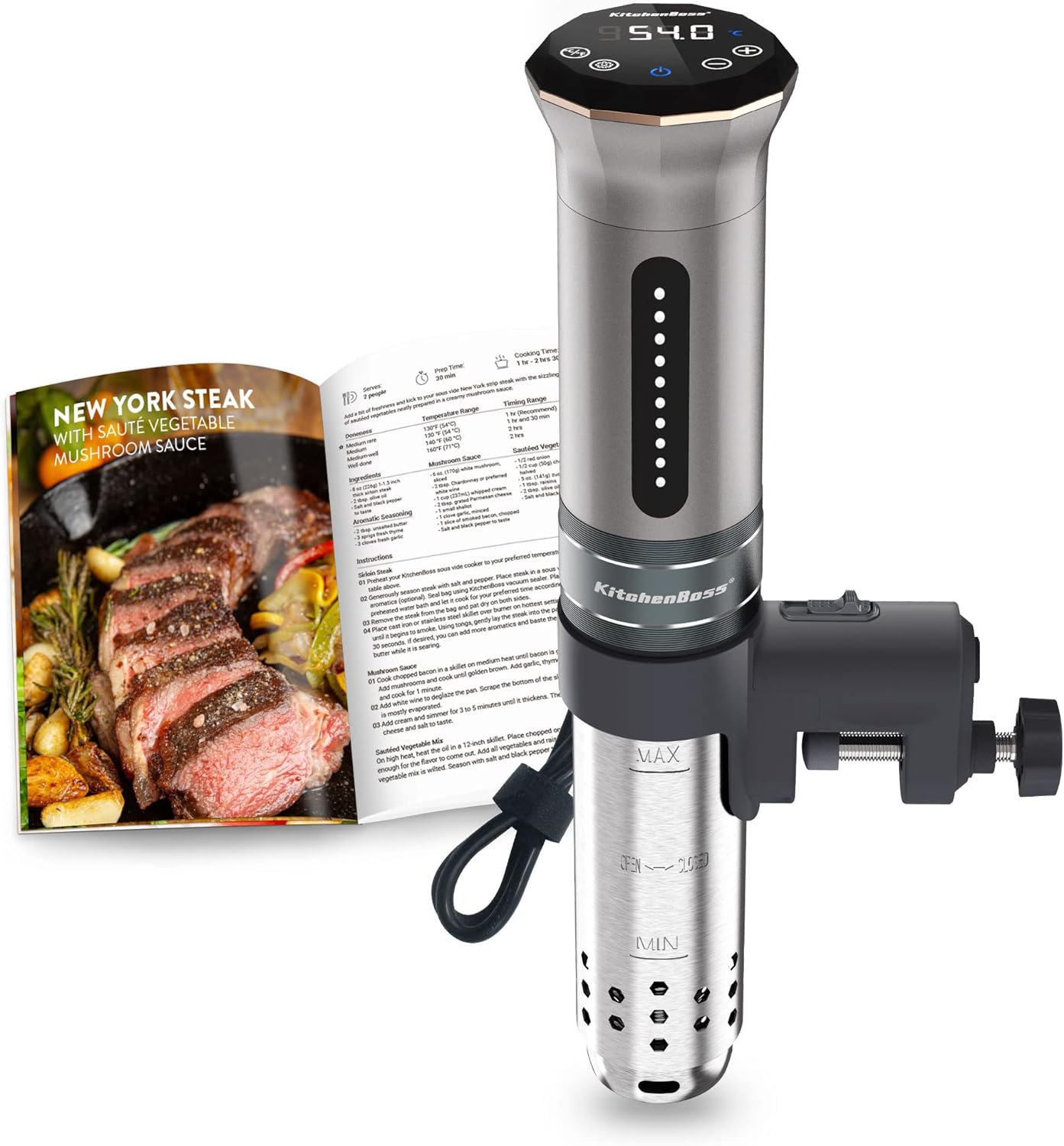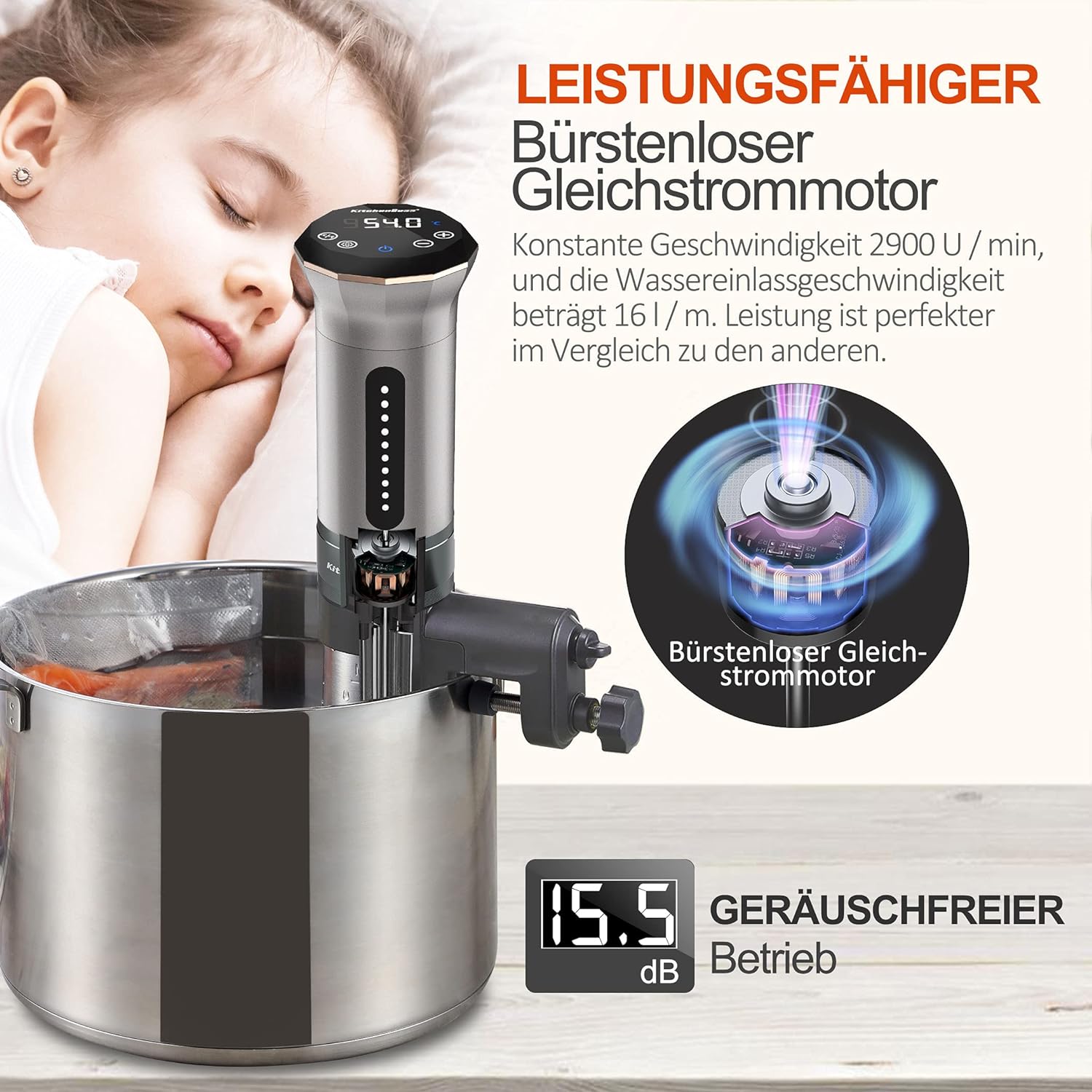 Mit Abmessungen von 6,7 x 8,3 x 38 cm, einer Kapazität von 15 Litern und einer Leistung von 1100 Watt eignet sich der Garer aus Edelstahl für die Zubereitung von Sous-Vide-Gerichten. Das Gerät verfügt über eine Timerfunktion und einen Metallpropeller, der für eine gleichmässige Zirkulation des Wassers sorgt und somit überall dieselbe Temperatur gewährleistet. Die Fixierklemme ermöglicht eine einfache Befestigung am Rand des Topfes, und der Garer kann auch in niedrigen Töpfen ab einer Höhe von sieben Zentimetern verwendet werden. Die interne Zirkulationsgeschwindigkeit liegt bei 16 L/min. Der bürstenlose Gleichstrommotor sorgt für eine leistungsstarke Rotation. Mit einem übersichtlichen LED-Multifunktionsdisplay und einer einfachen Bedienung per Touch-Display ist der G300S leicht zu steuern. Das Gerät arbeitet mit einer Geschwindigkeit von 2900 U/min bei einem Geräuschniveau von 15.5 dB. Im Lieferumfang sind 5 Vakuumierbeutel enthalten.