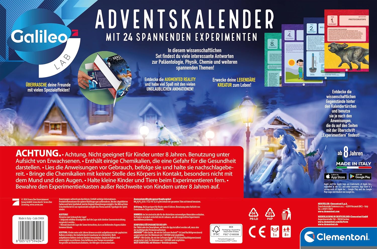 Galileo - Wissenschaft und Spiel. Klare und einfache Antworten auf viele faszinierende Fragen. Ein interessantes Spielprogramm für Jungen und Mädchen. Für alle aufgeweckten und wissensdurstigen Kinder. Zum Verstehen, Erleben und Beobachten unserer Umgebung. Hier werden Ursache und Wirkung von Phänomenen wissenschaftlich erklärt. Adventskalender mit 24 Accessoires bzw. kleinen Experimenten aus der Galileo-Welt. Jeden Tag eine neue Überraschung.