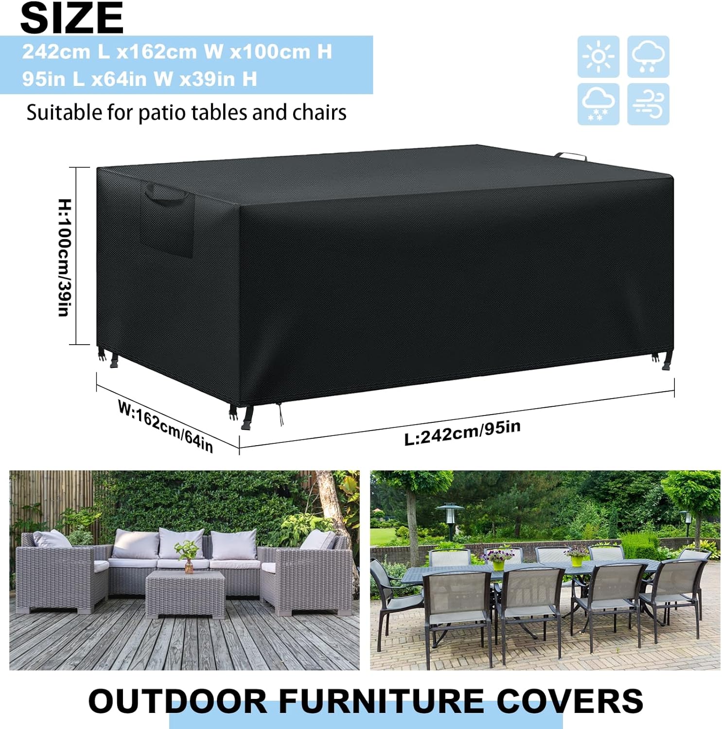 Die Gartenmöbel-Abdeckplane von WUAYAMI präsentiert sich als idealer Schutz für Gartenmobiliar. Ihr 3-lagiges Design gewährleistet einen zuverlässigen Schutz vor Witterungseinflüssen. Innenliegend überzeugt eine wasserfeste PU-Beschichtung, während das Äussere mit einer effektiven UV-festen Beschichtung versehen ist. Zwischen diesen Schichten befindet sich ein hochentwickeltes 420D Oxford Gewebe, das eine höhere Dicke als herkömmliche Materialien aufweist und somit wetter- und hitzebeständiger ist. Diese Konstruktion verspricht eine herausragende Beständigkeit, ist robust, dauerhaft und Zerfalls-beständig. Stabile Verschlüsse an den Ecken sorgen dafür, dass die Plane auch bei Wind sicher sitzt. Verstärkte Kordelzüge an den Seiten ermöglichen eine individuelle Anpassung der Straffheit. Das fortschrittliche Belüftungsdesign minimiert das Risiko von Schimmelbildung. Mit ihren Massen von 242 x 162 x 100 cm eignet sie sich ideal für Sitzgruppen, Gartentische und Terrassenmöbel.