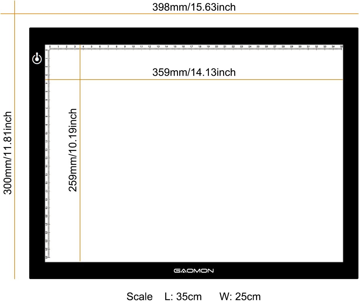Dieser Leuchttisch eignet sich zum Zeichnen und Skizzieren. Mit einer Dicke von 5 mm und einem Gewicht von 0.74 kg ist er besonders leicht. Die Diagonale des GB4 Leuchttischs beträgt 49.78 cm und die Skala misst 35 x 25 cm. Der beleuchtete Bereich des Leuchttischs ist 35.9 cm x 25.9 cm gross und die Gesamtabmessungen betragen 39.8 x 30 x 0.5 cm. Der Leuchttisch verfügt über eine praktische ON-/OFF-Funktion, die eine einfache Bedienung ermöglicht. Die Farbtemperatur des Leuchttischs beträgt 8000K-10000K. Der Lichtstrom beträgt 113LM und die Helligkeit beträgt 651CD/M2. Der Leuchttisch verfügt zudem über ein 2 Meter langes Netzkabel sowie eine Acryl-Oberfläche, die einfach zu reinigen ist.