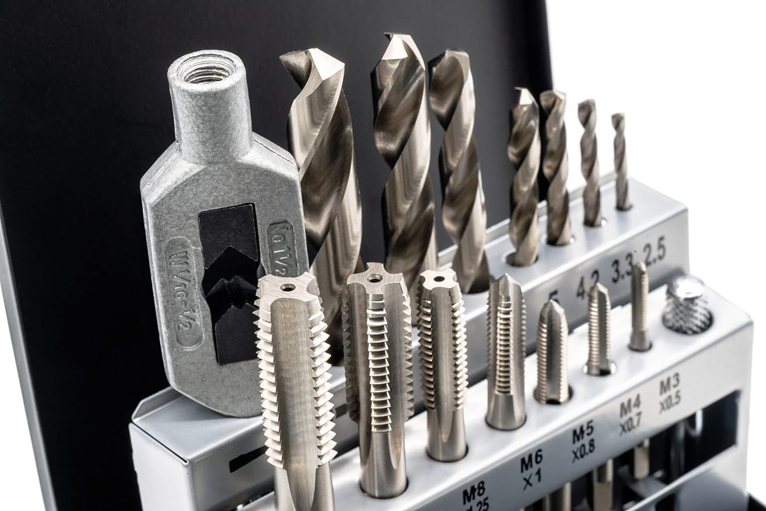 Das BAER Gewindeschneider Set HSSG ist ein umfangreiches Werkzeugsortiment für die präzise Herstellung von Innengewinden in einer Vielzahl von Materialien. In diesem Set enthalten sind hochwertige Einschnittgewindebohrer, Kernlochbohrer und ein verstellbares Windeisen, welche gemeinsam eine effiziente und zuverlässige Lösung für Gewindeschneidarbeiten bieten. Die Einschnittgewindebohrer aus legiertem Stahl sind in den Grössen M3 x 0,5, M4 x 0,7, M5 x 0,8, M6 x 1, M8 x 1,25, M10 x 1,5 und M12 x 1,75 verfügbar und eignen sich hervorragend für die Bearbeitung von Werkstoffen bis zu einer Festigkeit von 800 N/mm². Dies gilt sowohl für Durchgangs- als auch für Sacklöcher bis zu einer Tiefe von zwei Mal dem Durchmesser. Ihr Einsatzbereich erstreckt sich sowohl auf Hand- als auch auf Maschinenanwendungen. Die passenden Kernlochbohrer sind konzipiert, um den Vorbohrprozess für die Gewindegrössen M3 bis M12 zu optimieren. Sie verfügen über einen Zylinderschaft nach DIN 338 und können in Materialien wie Stahl, Gusseisen und Nichteisenmetallen wie Aluminium, Messing und Bronze eingesetzt werden. Ihre Härte behalten sie selbst bei Temperaturen von bis zu 600 °C bei. Ein hochwertiges, verstellbares Druckguss-Windeisen gemäss DIN 1814 rundet das Set ab. Es besitzt gehärtete Backen und ist geeignet für Gewindebohrer von M 1-12, 1/16-1/2 sowie G 1/8 mit Vierkanten zwischen 2,1 und 8,0 mm. Die langen Hebel des Windeisens unterstützen dabei, präzise und mit dem notwendigen Drehmoment das Gewinde zu schneiden. Verpackt in einer robusten Metallkassette, garantiert dieses Set die Langlebigkeit und Zuverlässigkeit der Werkzeuge. Das BAER Gewindeschneider Set HSSG stellt somit eine essenzielle Ausstattung für Fachkräfte im Bereich Metallbearbeitung und Mechanik dar, die Wert auf Präzision und Qualität legen.
