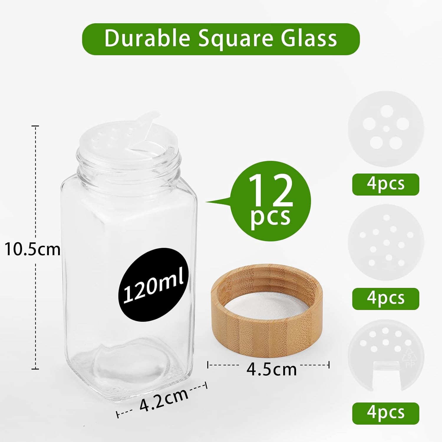 Das Gewürzgläser-Set besteht aus zwölf Gläsern mit Bambus-Deckel. Das Schraubverschluss-Design gewährleistet eine luftdichte, auslaufsichere und feuchtigkeitsbeständige Umgebung. Die Gewürzstreuer bestehen aus verdicktem Glas in Lebensmittelqualität, sind blei- und BPA-frei sowie korrosionsbeständig. Das Set beinhaltet 12 eckige Gewürzbehälter, 12 Gewürzsiebe mit drei verschiedenen Lochgrössen, 12 Etiketten zur Markierung, einen Trichter, einen Stift und eine Reinigungsbürste. Mit einem Fassungsvermögen von je 120 ml eignen sich die Gewürzgläser zur Aufbewahrung von Gewürzen oder Kräutern. Die mitgelieferten Etiketten und die transparenten Flaschen erleichtern die Identifizierung der Gewürze. Jedes Glas hat eine Grösse von 4.2 x 4.2 x 10.5 cm.