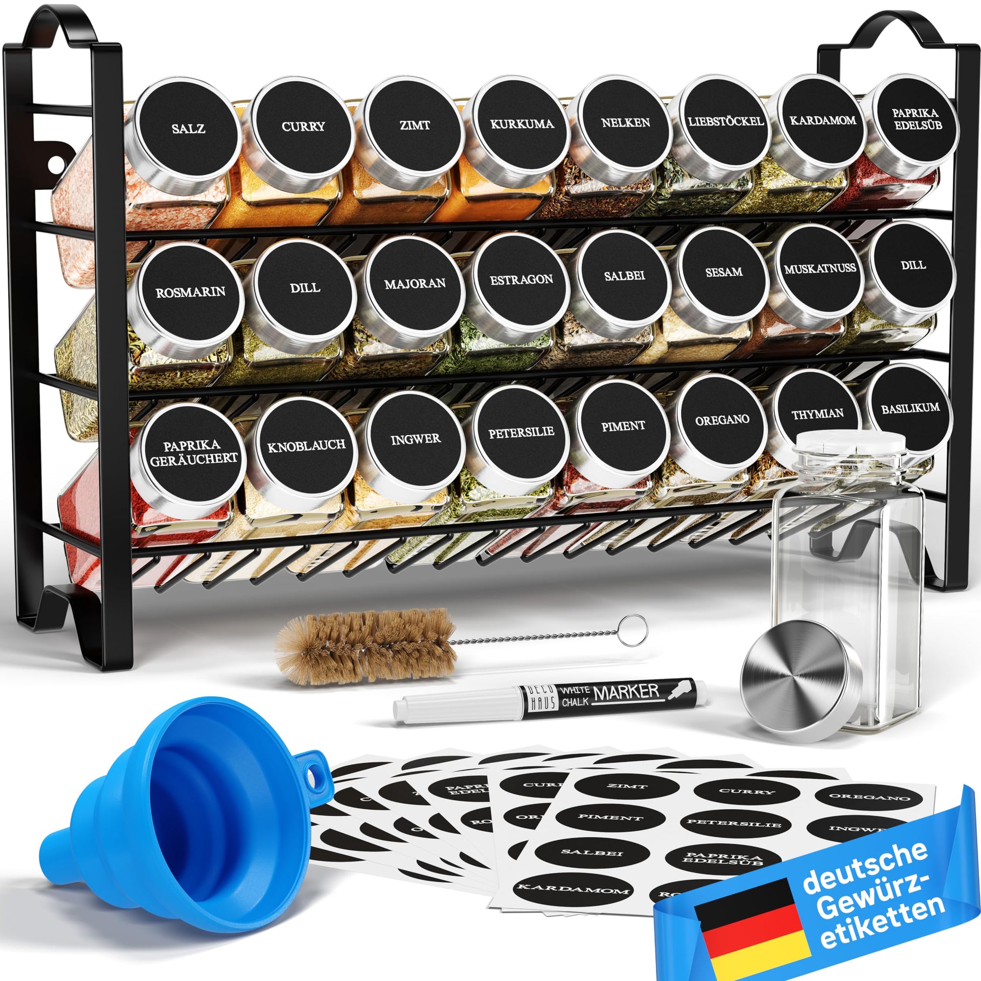 Das Gewürzregal mit Gewürzgläsern besteht aus Edelstahl in der Farbe Schwarz. Es hat die Abmessungen (B x T x H) 39.5 x 11 x 25 cm und bietet Platz für die 24 enthaltenen Gewürzgläser. Das Regal kann mit den Anti-Rutsch-Pads aufgestellt werden, oder mit den Dübeln und Schrauben aufgehängt werden. Die benötigten Materialien für beide Optionen sind im Lieferumfang enthalten. Die 24 Gewürzgläser werden aus Glas gefertigt und haben ein Volumen von 120 ml mit den Massen 4.3 x 4.3 x 10.5 cm. Die Deckel bestehen aus Edelstahl und verschliessen die Gläser luftdicht. Enthalten sind 2 verschiedene Streu-Aufsätze, je 24 Stück. Die Streuaufsätze und Dichtungen sind BPA-frei, was die Gewürzgläser lebensmittelecht macht und den Geschmack der Kräuter nicht verändert. Zusätzlich erhält man 48 blanke Etiketten, die man mit dem enthaltenen Kreidestift beschriften kann. Zur Befüllung wird ein faltbarer Silikontrichter mitgeliefert, sowie eine Bürste zur Reinigung.