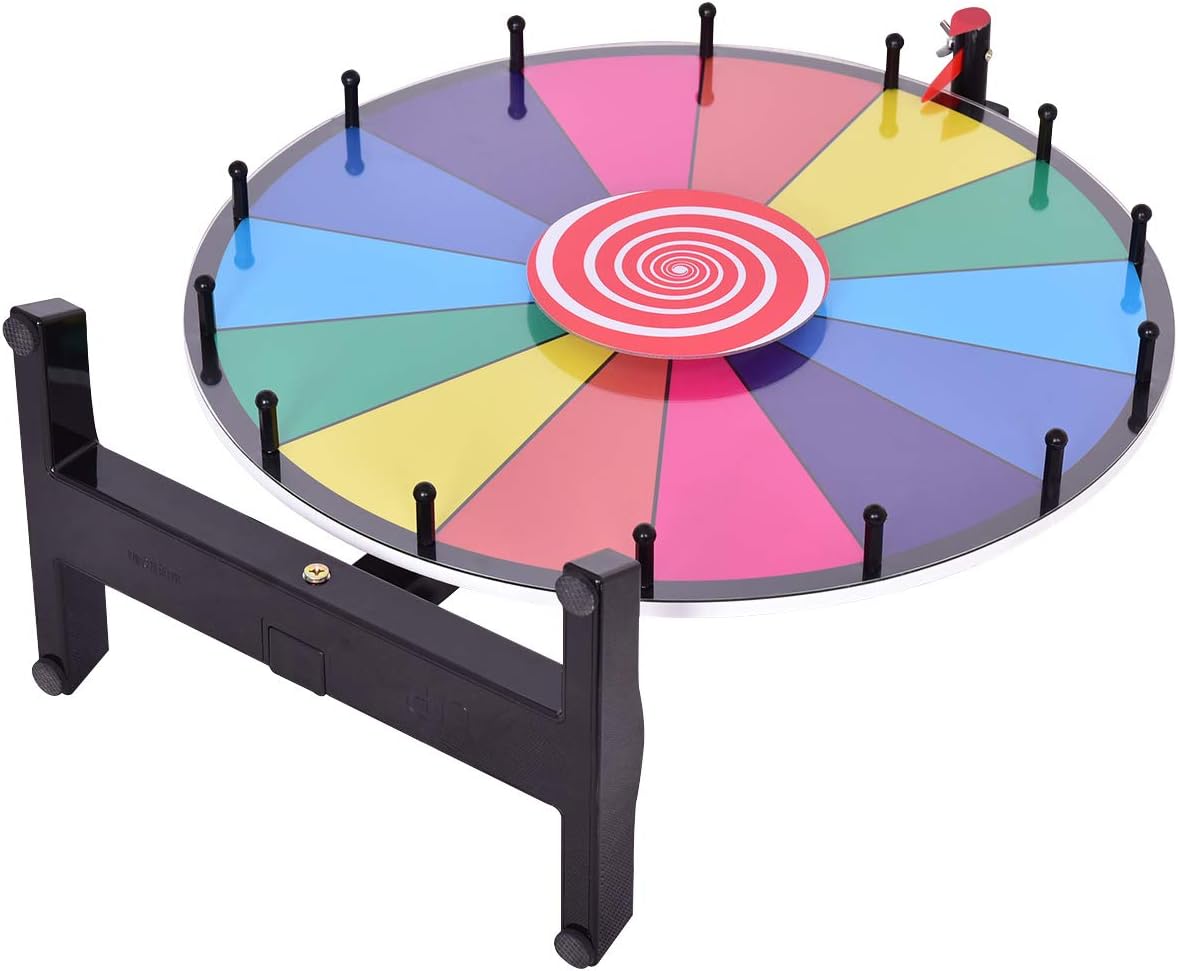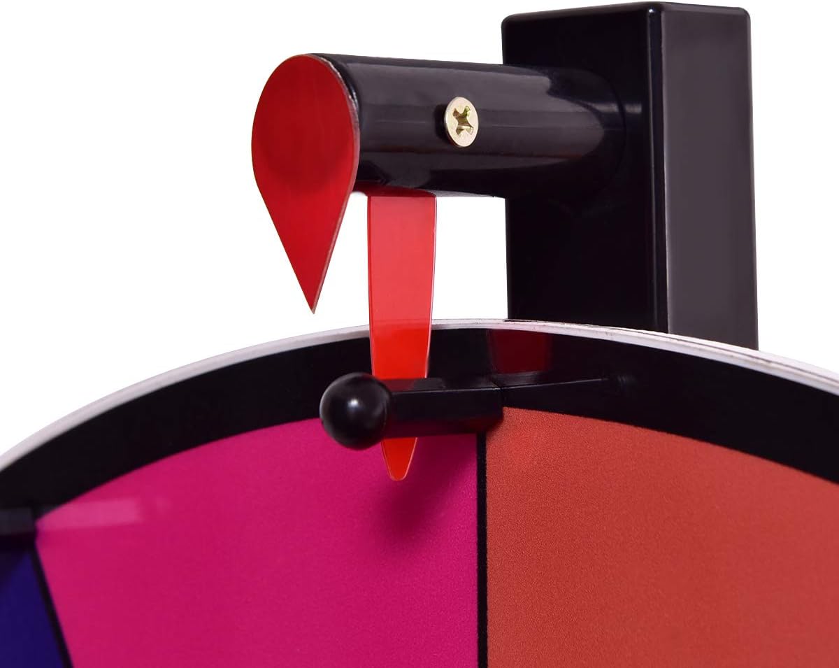 Das GOPLUS Glücksrad besteht aus robustem PVC (8 mm), hat einen Durchmesser von 45 cm sowie eine Standstangenlänge von 55 cm. Der Lieferumfang umfasst das Glücksrad (7 verschiedene Farbfelder), sowie ein Zubehör-Set mit 2 Ersatzzeigern, 1 Schraube, 1 Stange und 1 Tafelwischer. Zusätzlich sind 30 Schrauben enthalten. Das Glücksrad ist leicht zu reinigen, abriebfest und langlebi. Es lässt sich problemlos lagern und bequem montieren, wodurch es sowohl für kommerzielle als auch private Anwendungen geeignet ist. Das Produkt wiegt 4.5 Kilogramm.