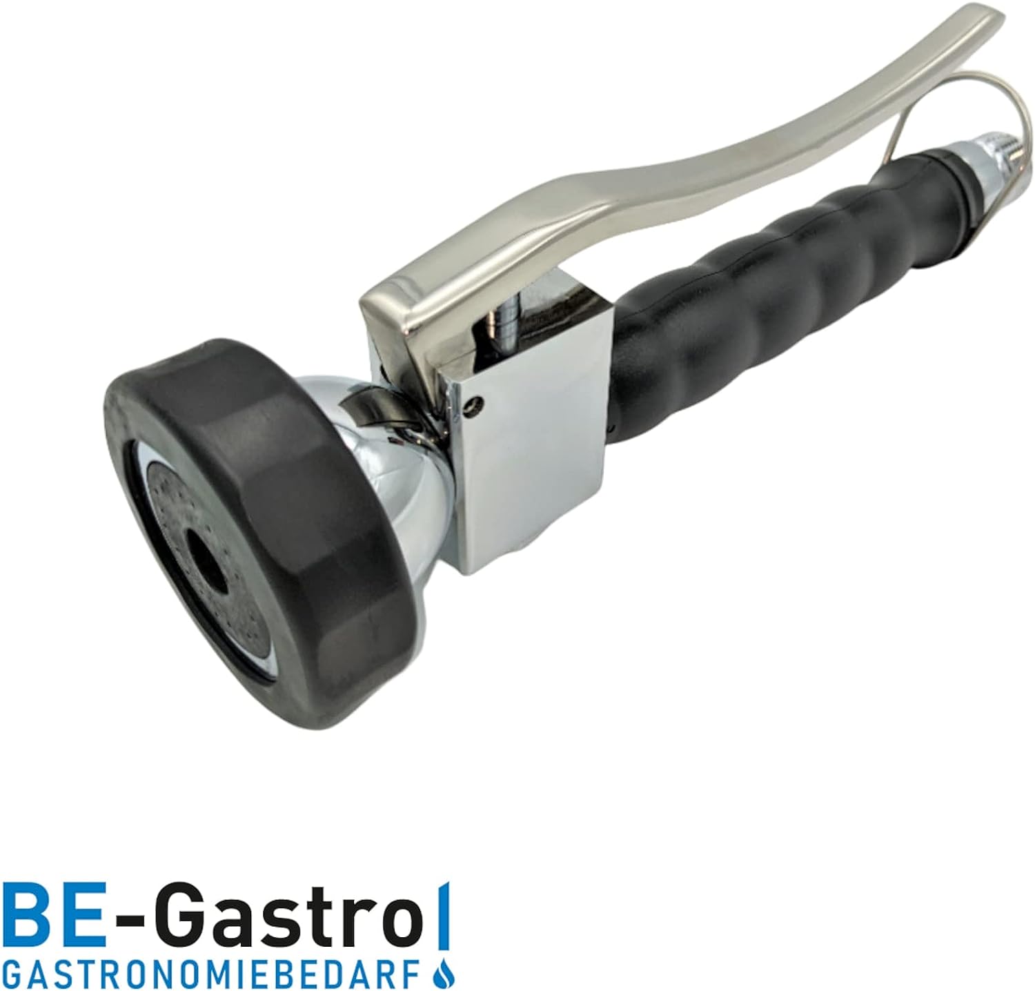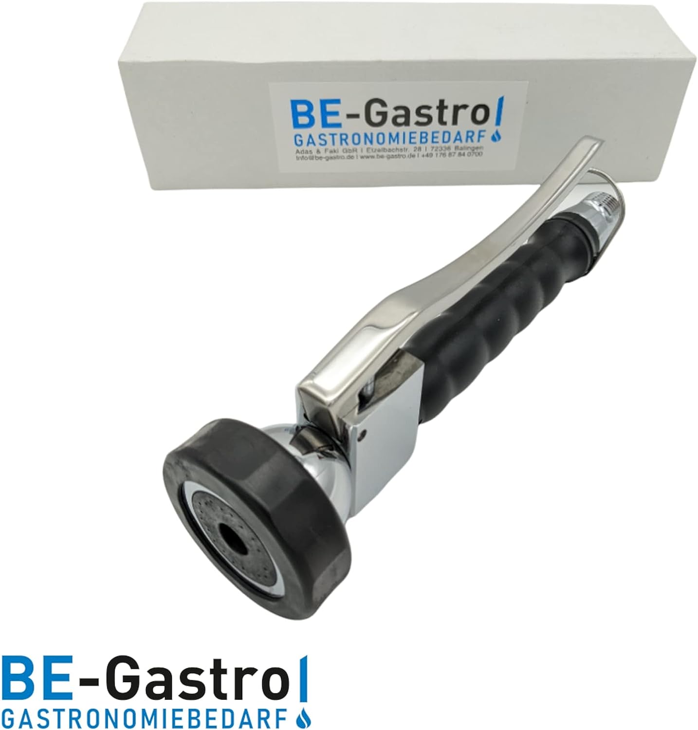 Die Handbrause ist mit einem standardisierten 1/2" Anschlussgewinde ausgestattet und dadurch nicht nur für Geschirrbrausen, sondern auch für die meisten Gastroarmaturen universell einsetzbar. Der robuste Griff besteht aus massivem Edelstahl und gewährleistet Stabilität. Der ergonomisch optimierte Griff bietet einen sicheren Halt, ermöglicht eine präzise Dosierung des Wasserdrucks und sorgt für angenehme Bedienung. Der strapazierfähige Feststellbügel ermöglicht eine längere Nutzungsdauer und die manuelle Kontrolle des Wasserstrahls. Das Gewicht beträgt 0.8 kg bei einer Länge von 23 cm