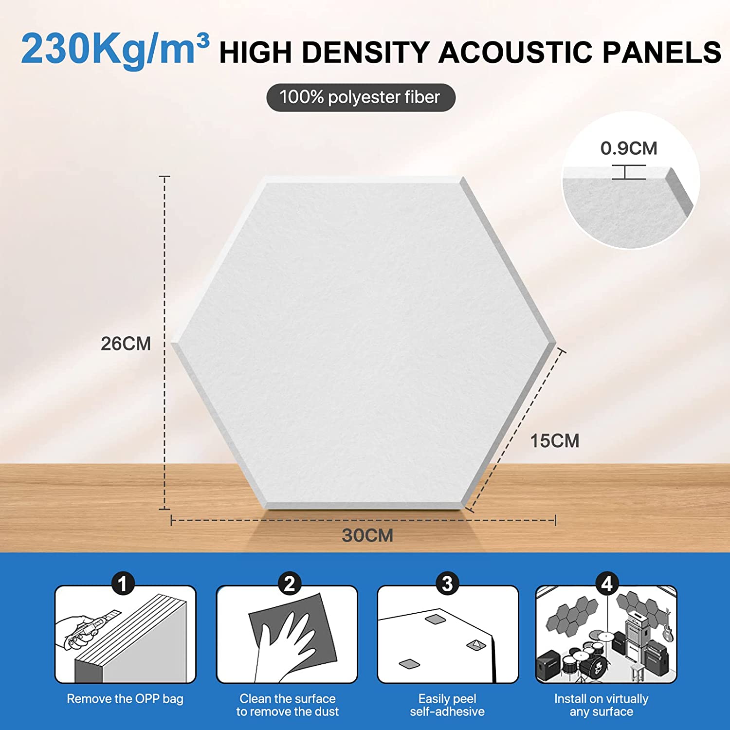 Die Hexagon Akustikplatten-Set besteht aus 12 Stück, die jeweils eine Grösse von 30 x 26 x 0.9 cm haben und in einem stilvollen Hexagon-Design gestaltet sind. Die Platten sind aus hochdichtem Material hergestellt und bieten daher eine Schalldämmung, mit einer Dichte von bis zu 230 kg/m³. Jede Platte wird mit einem Aufkleber geliefert, der eine schnelle und einfache Montage ermöglicht. Die Platten können auch problemlos auf die gewünschte Grösse zugeschnitten werden, um eine individuelle Installation zu ermöglichen.
