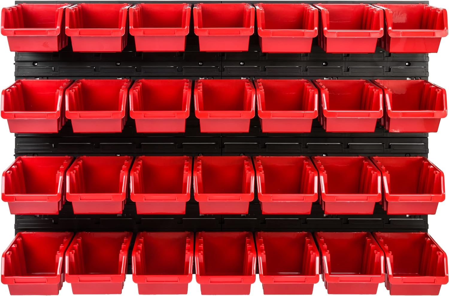 Das Wandregal von SimpleThing in den Farben Rot und Schwarz bietet die optimale Kombination aus Funktionalität und Platzersparnis. Dieses System besteht aus robustem Kunststoff, welcher sich durch hohe Resistenz gegen extreme Temperaturen, Chemikalien, Feuchtigkeit und mechanische Beschädigungen auszeichnet. Mit einer Gesamtgrösse von 1152 x 780 mm sind vier Wandplatten (576 x 390 mm) strategisch positioniert, um jegliches Werkzeug übersichtlich aufzunehmen. Das Set ist ausgestattet mit 28 roten Stapelboxen, die mit einer Grösse von 160 x 230 x 120 mm genug Raum für Kleinteile bieten und die durch die Möglichkeit der Etikettierung leicht zu organisieren sind. Ein besonderes Merkmal dieses Lagersystems ist seine Erweiterbarkeit durch zusätzliche Module, was die Anpassung an den verfügbaren Platz ermöglicht. Die Wandmontage ermöglicht bequemen Zugang zu allen Werkzeugen und sorgt für Übersichtlichkeit.
