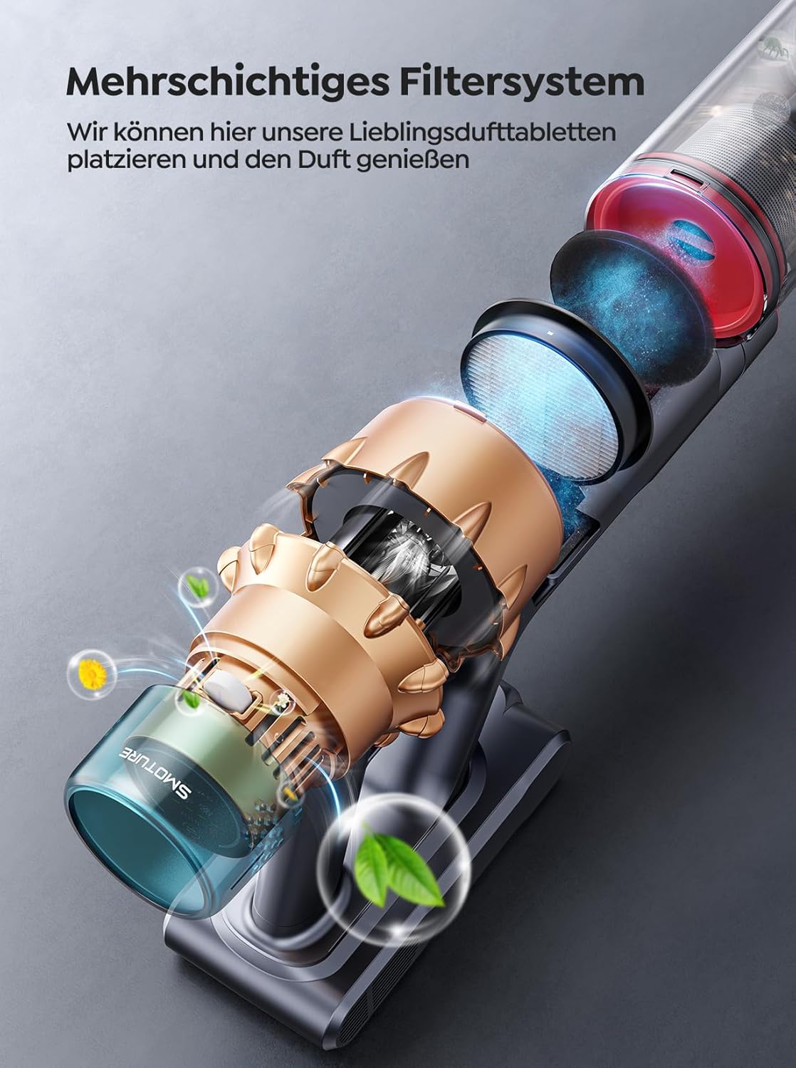 Der Stabstaubsauger mit einer Saugleistung von 45000Pa und 550 Watt eignet sich sowohl für Teppiche als auch für Hartböden. Mit einer Laufzeit von bis zu 60 Minuten bietet das Gerät eine effiziente Reinigung. Das Gerät verfügt über ein Behältervolumen von 1,6 Litern und ist mit einer Anti-Verhedderungsbürste ausgestattet, um das Verheddern von Haaren zu verhindern. Der Akku-Staubsauger ist mit einem HEPA-Filter ausgestattet, der 99 % der Partikel bis zu einer Grösse von 0.3 µm entfernt. Der kabellose Betrieb ermöglicht einen flexiblen Einsatz, und mit einem maximalen Geräuschpegel von 62 dB arbeitet er relativ leise. Die Steuerung erfolgt über einen LED-Touchscreen mit vier Betriebsstufen, die einen Automatikmodus und einen manuellen Modus umfassen. Die wandmontierte Ladestation ermöglicht das Aufladen sowie die Aufbewahrung des Geräts.