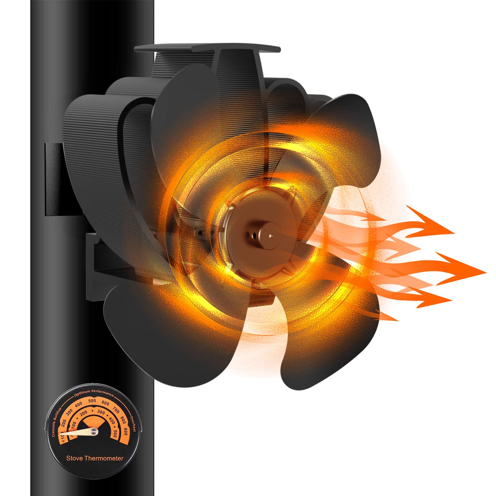 Dieser energiesparende Kaminventilator in der Farbe Schwarz benötigt keinen Strom, er funktioniert in Verbindung mit einem Kamin oder Holzofen und erzeugt Wärme. Wenn an der Ofenoberfläche eine Temperatur von 80° C erreicht ist, dreht sich der Lüfter automatisch, je heisser das Feuer, desto schneller drehen sich die Flügel (bis zu 350 CBM / H). Durch zwei hochtemperaturbeständige Magnete wird der Ventilator am Schonsteinrohr (Durchmesser: ca. 120 - 150 mm) befestigt. Es wird ein Eisenbügel zur Befestigung mitgeliefert, falls das Schornsteinrohr nicht aus Eisen ist. Die Lüfterbasis und die Flügel bestehen aus eloxiertem Aluminium, welches rostfrei, verschleissfest und wärmeleitfähig ist. Das Aluminium hebt die Ränder des Ventilators leicht an, wenn die maximale Betriebstemperatur (350° C) erreicht ist, um den Motor zu schützen. Der Ventilator erzeugt Geräusche niedriger als 25 dB. Im Lieferumfang enthalten sind ein Kaminventilator, ein Eisenring, zwei Schrauben, ein Innensechskant und eine Bedienungsanleitung.