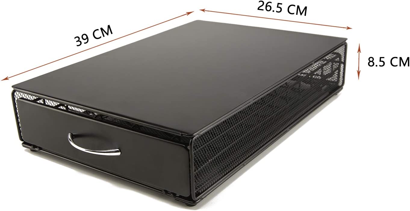 Der Kapselhalter ist 39 x 26.5 x 8.5 cm gross und bietet in vier Reihen Platz für bis zu 40 Vertuo-Kapseln. Er ist stapelbar und somit platzsparend und sieht dabei elegant aus. Die Schublade gleitet leicht heraus, damit die Kapseln problemlos zugänglich sind. Der Kapselhalter besteht aus kratzfestem und wasserdichtem Metall. Durch die verdickte Platte kann auch die Kaffeemaschine selbst auf dem Halter platziert werden.