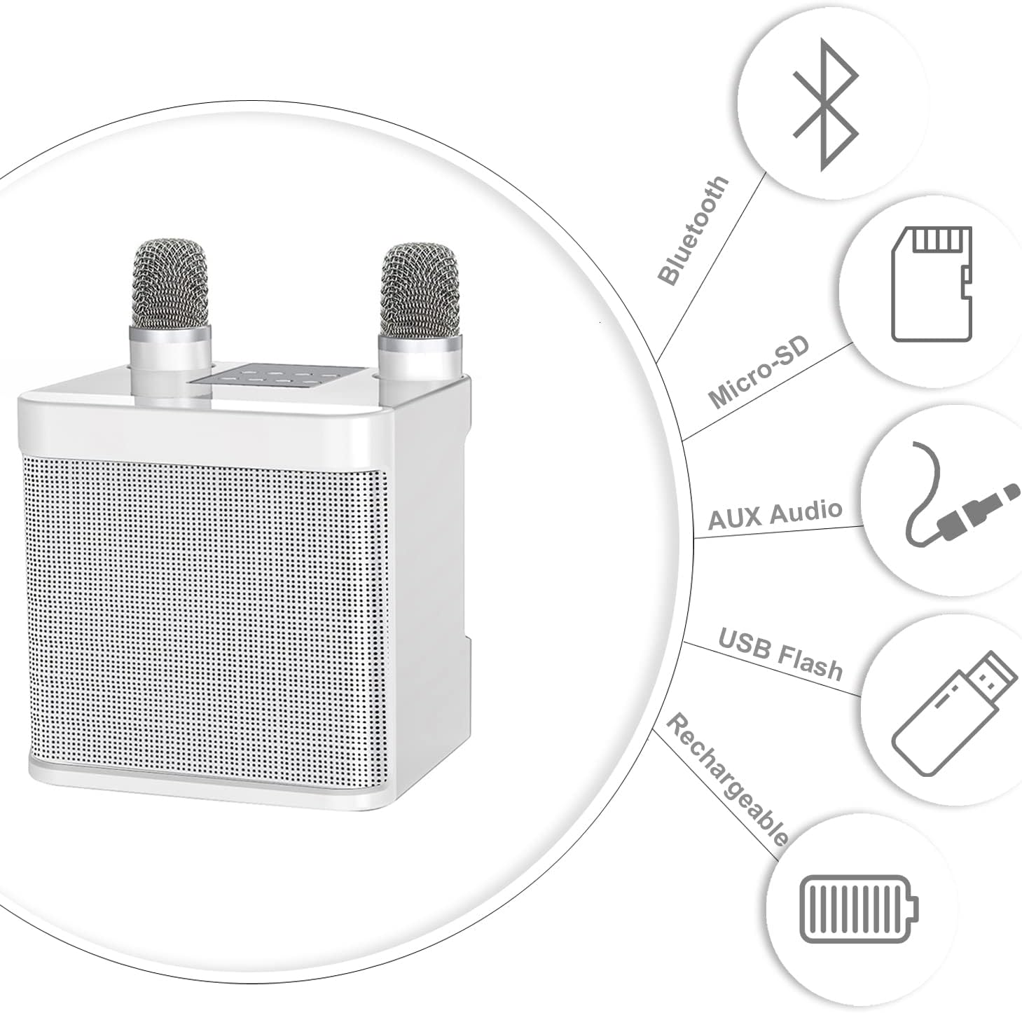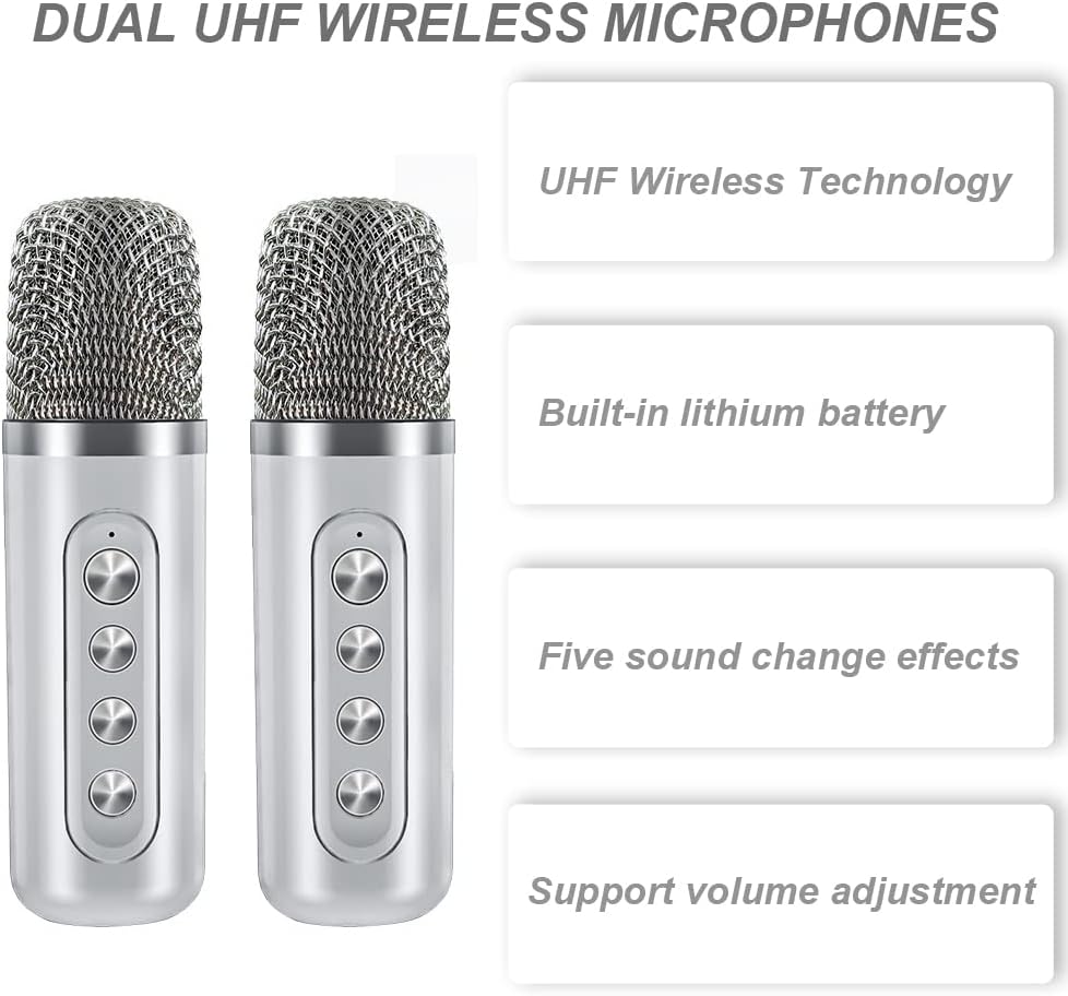 Die Karaoke Anlage präsentiert sich als ein unterhaltsames und vielseitiges Audio-Gerät für Gesangsbegeisterte jeder Altersgruppe. Mit zwei kabellosen Mikrofonen ausgestattet, die simultan für Duetts oder Gesangswettbewerbe genutzt werden können, verspricht das System eine lebhafte Atmosphäre. Die eingebauten Akkus der Mikrofone und des Lautsprechers gewährleisten mit einer Kapazität von 3000mAh bzw. 1500mAh zwischen 3 und 5 Stunden Musikgenuss. Die Maschine ist nicht nur über Netzstrom, sondern auch über Powerbank ladbar, was eine kontinuierliche Karaoke-Session garantiert. Die Soundqualität überzeugt durch eine eindrucksvolle Geräuschunterdrückung sowie einen kraftvollen Subwoofer, der für tiefen Bass und Surround-Sound sorgt. Neben Bluetooth bietet das Gerät unterschiedliche Anschlussmöglichkeiten, darunter TF-Card/USB-Eingängen und AUX-Eingang, was nahtloses Streaming und die Option, den Text über Smart-TV mitzuverfolgen, ermöglicht. Durch die "VOCAL CUT"-Funktion lässt sich zudem die Originalstimme der Lieder reduzieren, um eigenen Gesang in den Vordergrund zu rücken. Ideal als Geschenk für Kinder und Jugendliche, eignet sich diese kompakte und doch klangstarke Karaoke Maschine gleichermassen für Partys und familiäre Aktivitäten.
