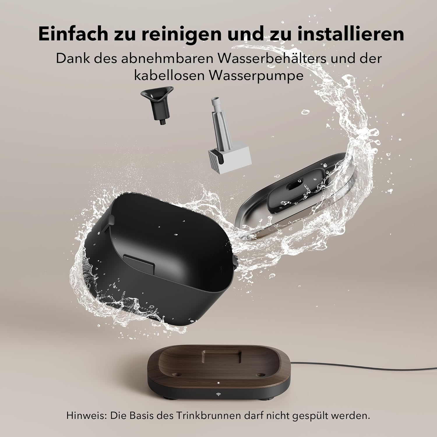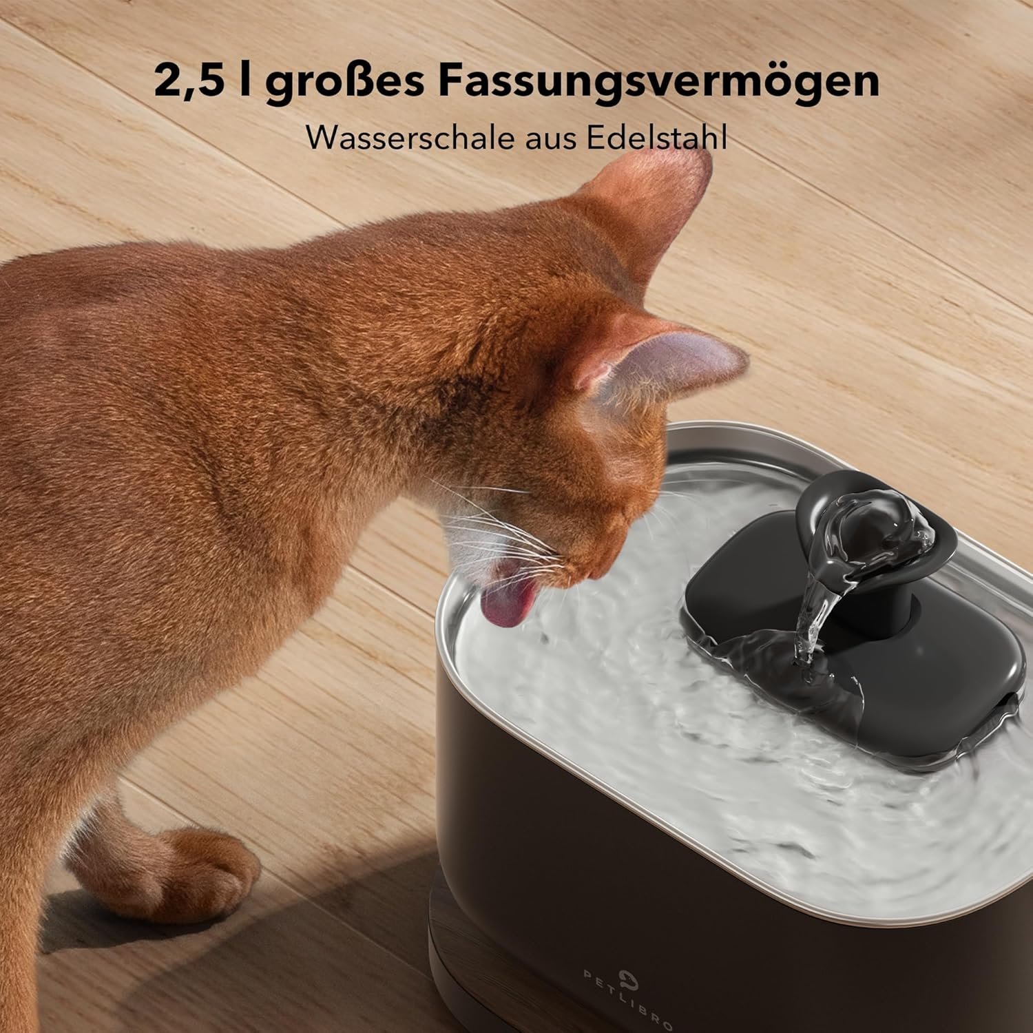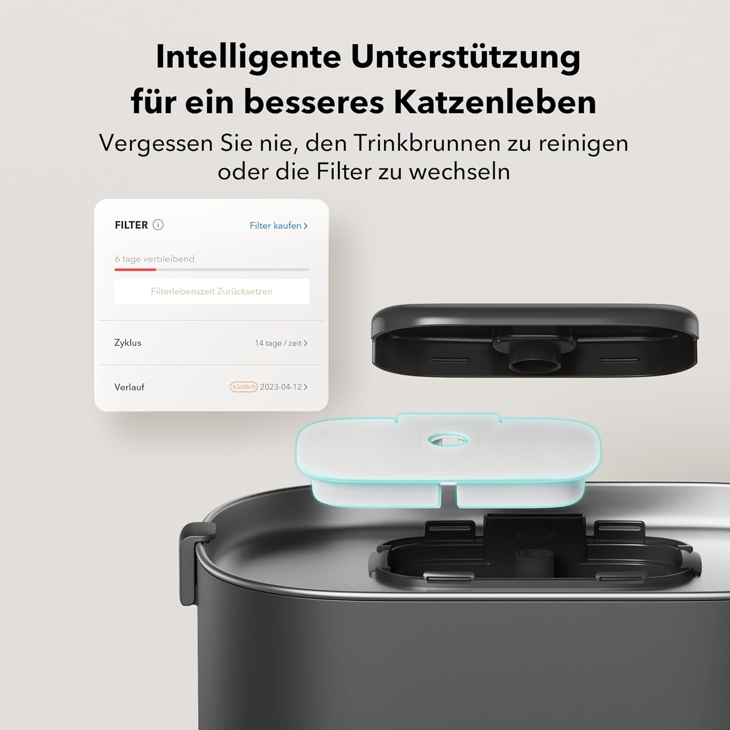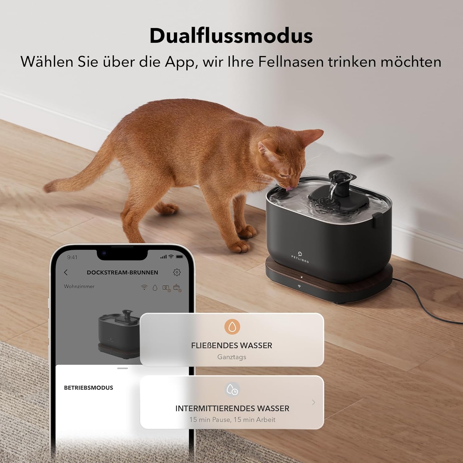 Der PETLIBRO Katzenbrunnen verbindet moderne Technologie mit dem natürlichen Trinkbedürfnis von Katzen. Mit einem Volumen von 2,5 Litern bietet dieser Brunnen eine konstante Versorgung mit frischem, gefiltertem Wasser, das dank des mehrschichtigen Filtersystems frei von Schwermetallen und Verunreinigungen ist. Das Gerät aus lebensmittelechtem Edelstahl 304 und BPA-freiem Material verhindert die Bildung von Katzenakne. Mit einem Geräuschpegel von nur 23 dB ist der Katzenbrunnen leise. Durch die intelligente APP-Steuerung, die über eine 2,4GHz Wi-Fi-Verbindung läuft, können Nutzer den Wasserstand in Echtzeit überwachen sowie Erinnerungen für Filterwechsel und Reinigung erhalten. Die Pumpe des Brunnens ist kabellos und schaltet sich bei niedrigem Wasserstand automatisch ab, wobei ein 130-ml-Notreservoir für Sicherheit bei Stromausfall sorgt. Der Trinkbrunnen lässt sich leicht installieren, reinigen und über eine Wandsteckdose betreiben. Im Lieferumfang sind ein Dockstream Katzenbrunnen, ein Ersatzfilter, eine kabellose Wasserpumpe, ein Netzteil und ein Netzkabel enthalten.