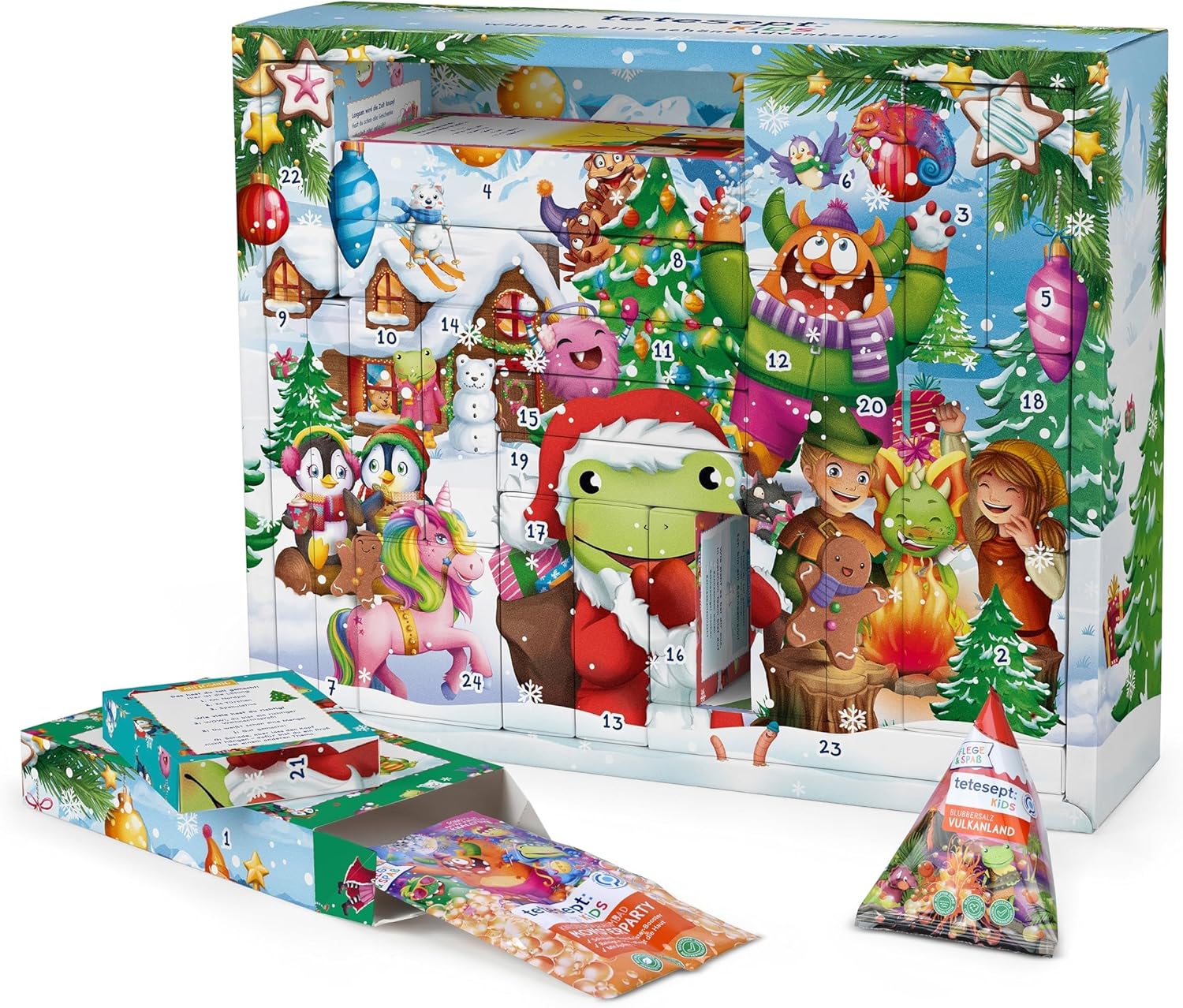 Der tetesept Badespass Adventskalender bringt Kindern täglich neue Überraschungen und kreativen Wasserspass mit Badeknete, Schaum-, Blubber- und Effektbädern in vielen fantasievollen Varianten wie Elfenzauber, Dinos und Drachen. Begleitet durch kleine Geschenke vom Lutz Mauder Verlag – wie Puzzle, Rätsel- und Zauberblöcke sowie Tattoos und Pflaster – verkürzt der Kalender die Adventszeit. Der Box-in-Box-Kalender bietet zwei schöne Weihnachtsmotive, die sich täglich zur grossen Puzzelseite zusammensetzen.
