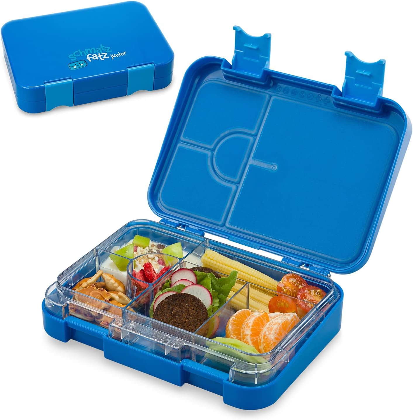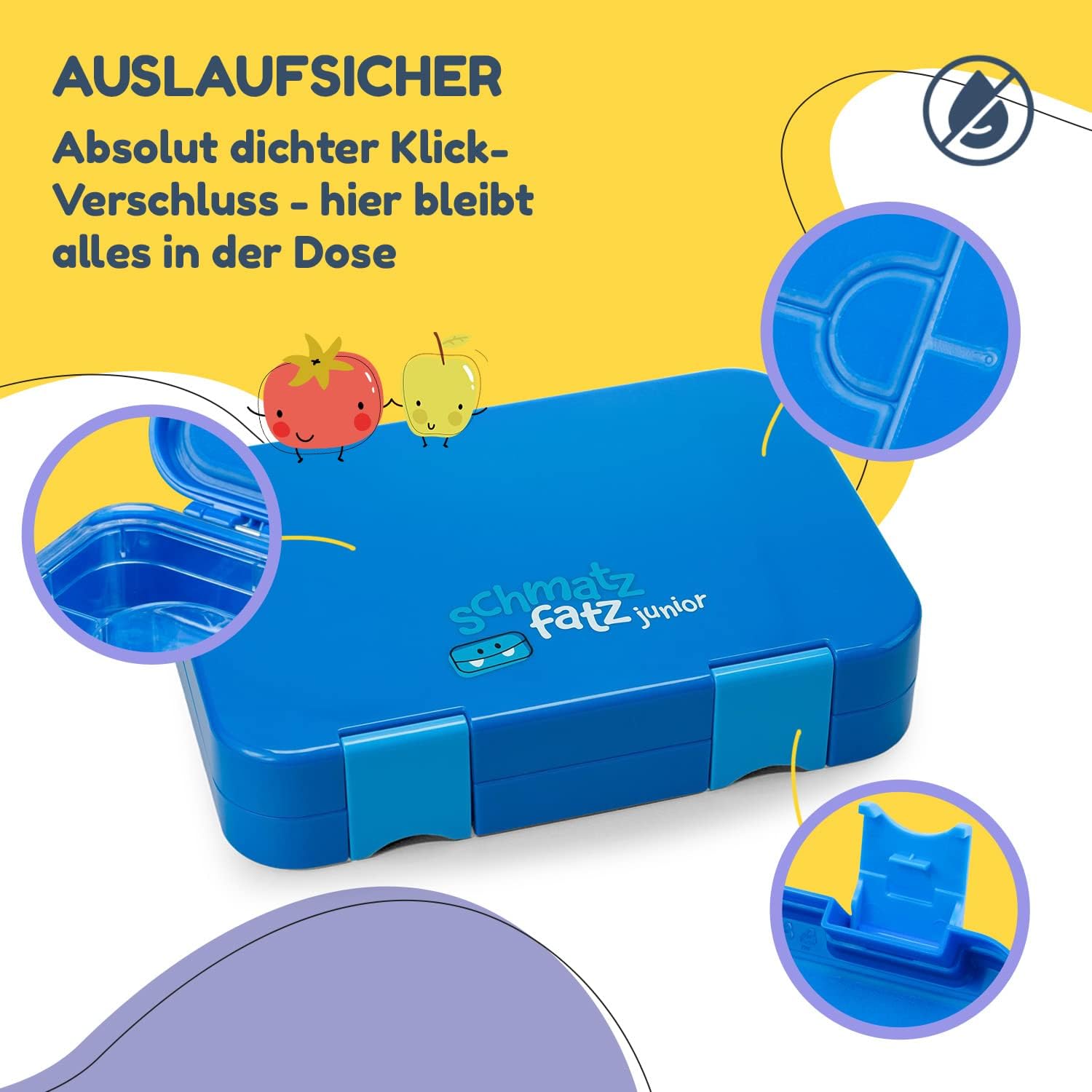 Die schmatzfatz Bentobox ist ein farbenfroher und lustiger Begleiter, der dafür sorgt, dass sich Kinder jeden Tag auf ihr liebevoll zubereitetes Vesper freuen. Der einfache und sichere Verschluss lässt sich auch von Kinderhand leicht öffnen. Dank der Dichtungen im Deckel der Brotdose bleibt das Pausenbrot stets trocken, da sie verhindern, dass feuchte Lebensmittel auslaufen. Alle Teile der Vesperbox können problemlos herausgenommen und separat in der Spülmaschine gereinigt werden. Die Brotdose ist komplett frei von Schadstoffen und Weichmachern. Zusätzlich werden stabile Zusatzbehälter mit 4-6 Einzelfächern direkt mitgeliefert, um noch mehr Ordnung, Vielfalt und Frische ins Snackerlebnis zu bringen.