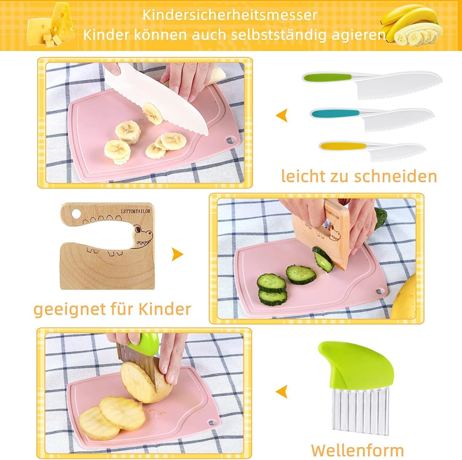 Das 41-teilige LETTO & TAILOR Kindermesser- und Brotausstechformen-Set ermöglicht es Kindern, sicher bei der Essenszubereitung mitzuhelfen. Die Messer schneiden Brot, Obst und Gemüse, während verschiedene Formen wie Micky und Dinosaurier kreative Gerichte ermöglichen. Das Set enthält zudem Obstgabelpicks und ist kindersicher ausgestattet, was ein lehrreiches Erlebnis bietet.