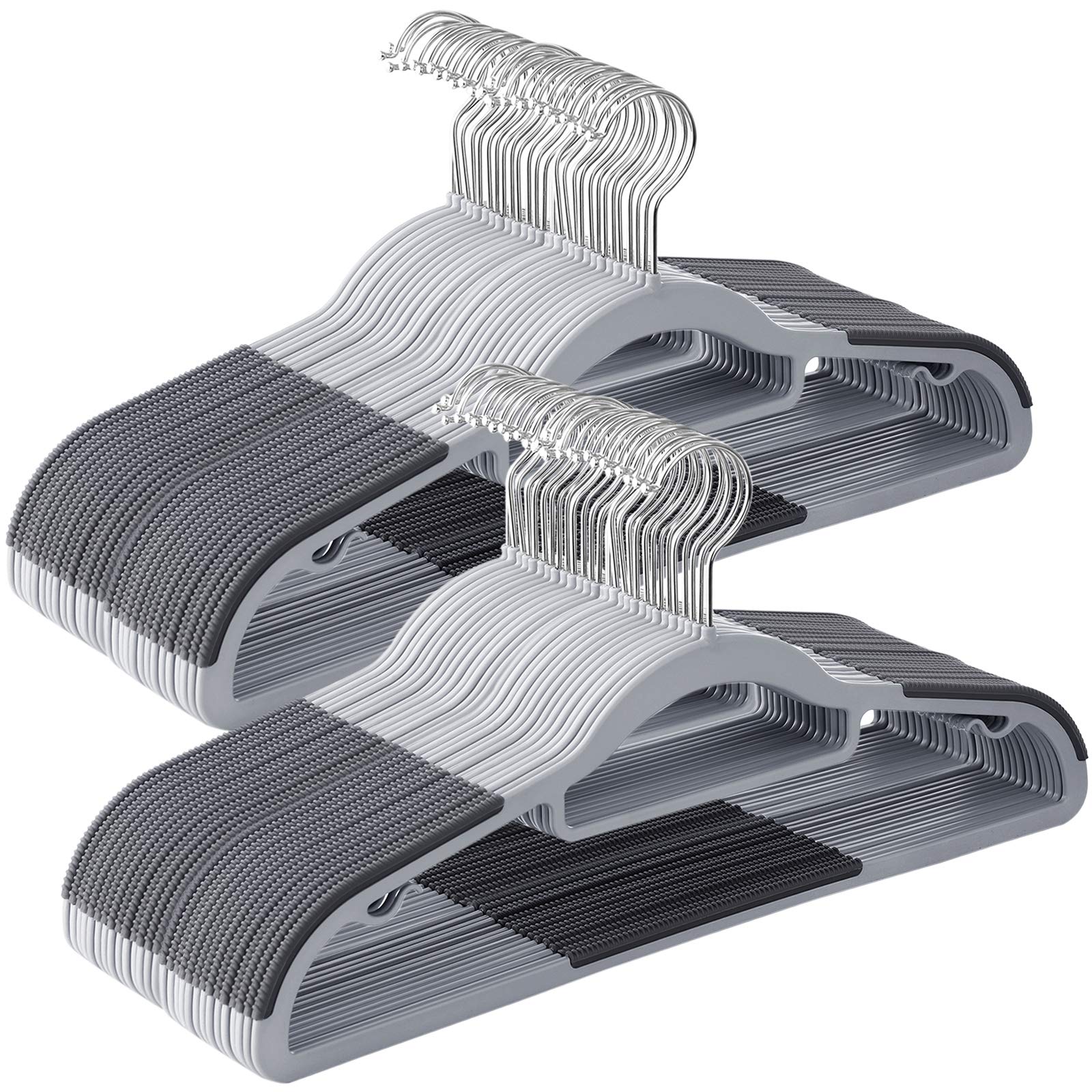 Die 50 Kleiderbügel in der Farbkombination Silber, Hellgrau und Dunkelgrau bestehen aus ABS-Kunststoff und Metallhaken und eignen sich für die Aufbewahrung von Kleidungsstücken. Dank der Gummi-Aufsätze im Schulterbereich und an der Hosenstange bieten sie einen sicheren und festen Halt für Kleidungsstücke. Die Bügel sind mit 0.5 cm Dicke platzsparend. Die Metallhaken der Bügel sind um 360° drehbar.
