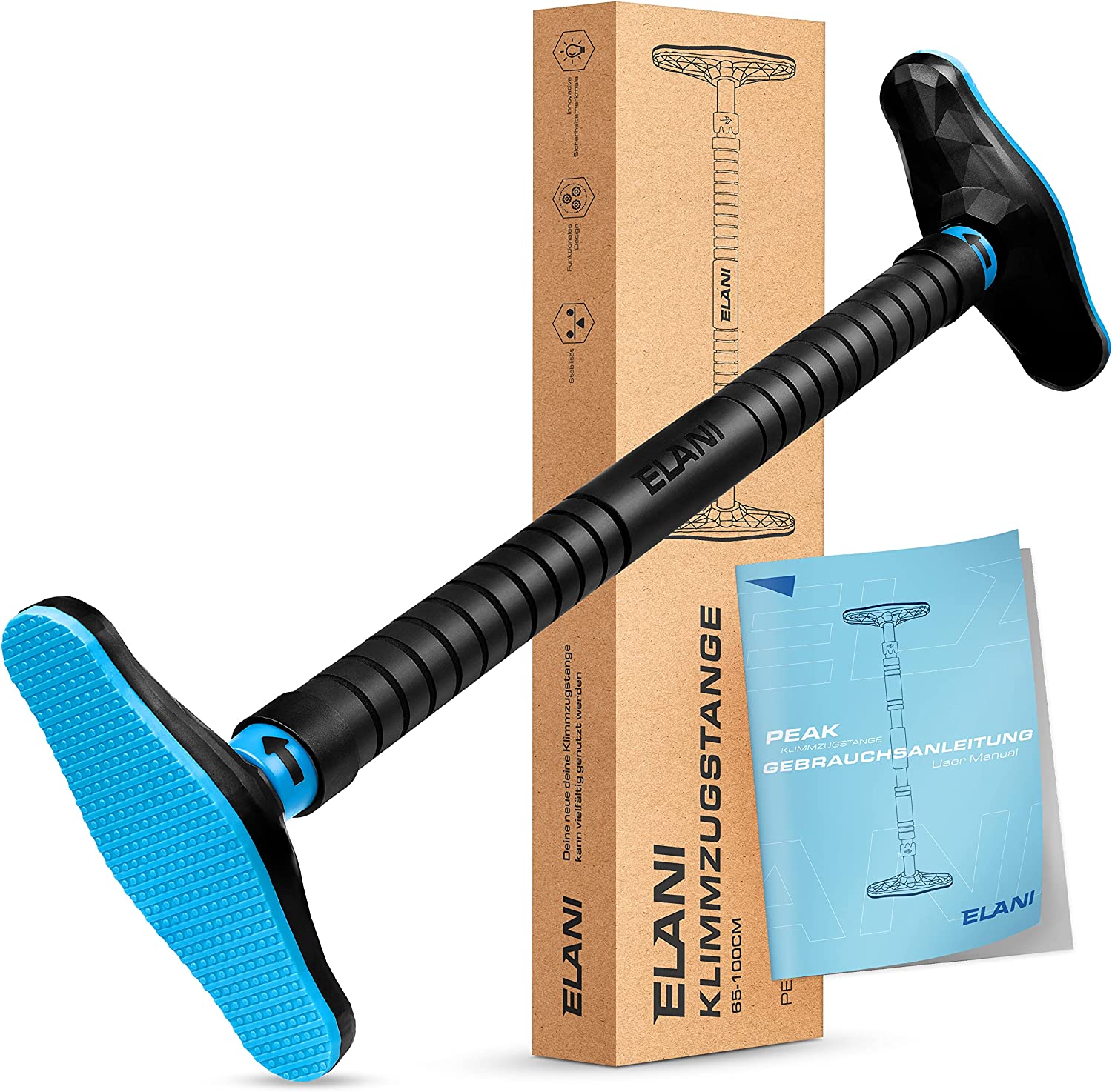 Die Klimmzugstange kann ohne Schrauben in den Türrahmen eingeklemmt werden. Die Breite ist stufenlos zwischen 70 und 90 cm einstellbar. Die 19 cm grosse Auflagefläche und die beidseitigen Gewindeschrauben verhindern ein Verstellen der Stange. Während des Trainings wird der Belastungsdruck nach aussen abgegeben, sodass die Stange bis 300 kg belastbar ist. Die Schaumstoffgriffe besitzen Griffrillen, sind rutschfest, ungiftig und geruchlos. Das Gewicht der Klimmzugstange beträgt 2 kg und sie ist aus stabilem Eisenrohr gefertigt. Das Produkt eignet sich nicht für die Installation in Holztürrahmen, da die Tür durch den hohen Druck beschädigt werden könnte.