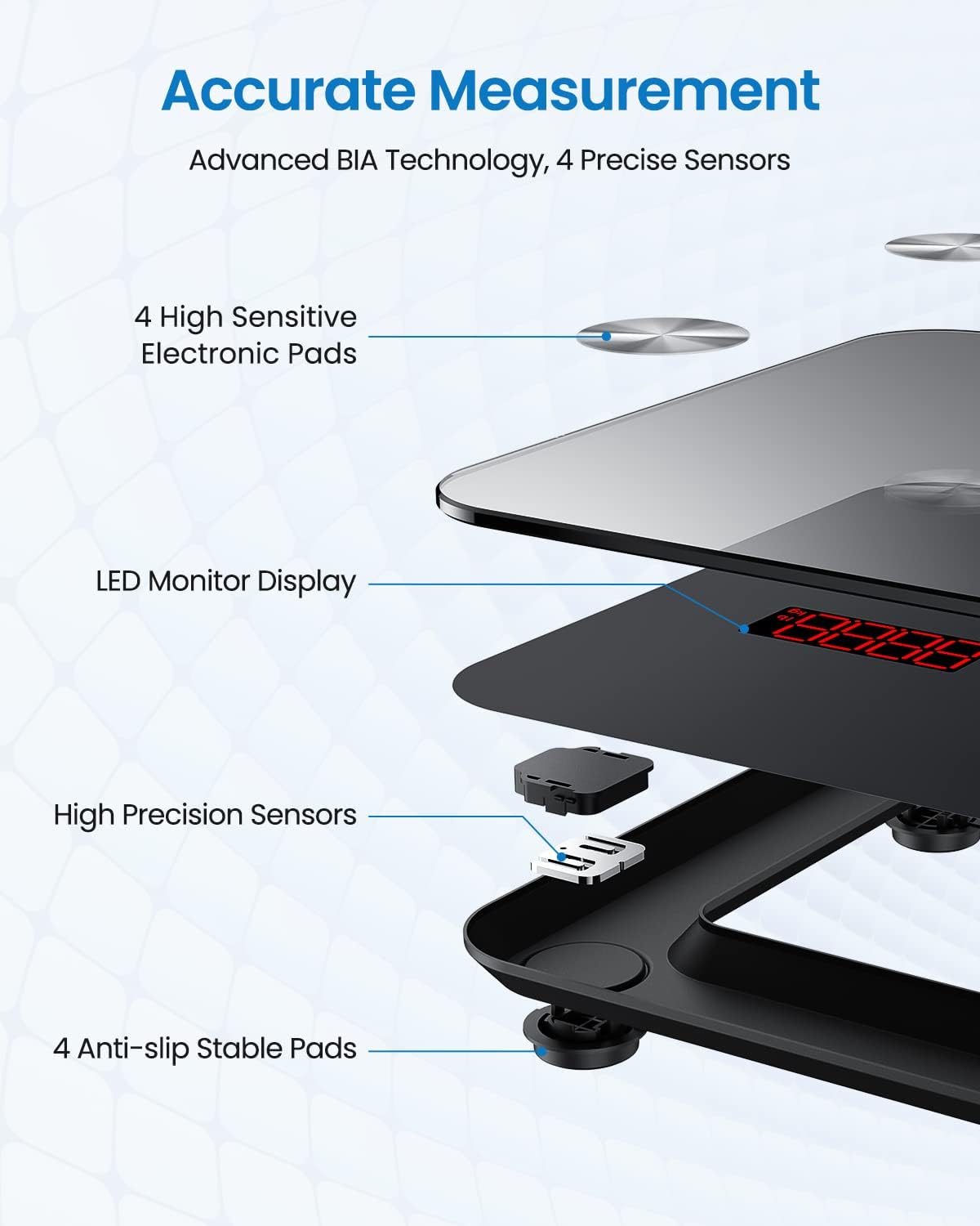 Diese multifunktionale Körperfettwaage lässt sich in wenigen Schritten mit der RENPHO-App, die sich aus dem App Store oder Google Play kostenlos herunterladen lässt, verbinden und synchronisiert sich mit anderen Fitness-Apps (Samsung Health, Fitbit, Apple Health, Google Fit). Die Waage bietet eine moderne Körperanalysefunktion anhand der neusten BIA-Technologie (Bioelektrische Impedanzanalyse). Nachdem 13 wichtige Körperdaten (wie beispielsweise Gewicht, BMI, Körperfettanteil, Wasseranteil, Muskelmasse, Knochenmasse, biologisches Alter und Grundumsatz) gemessen wurden, werden die Messwerte in übersichtlichen Grafiken angezeigt. Diese Daten können in der oben genannten App als Trendlinien in wöchentlicher, monatlicher und jährlicher Ansicht dargestellt werden. Die Waage bietet hierbei die Möglichkeit auch die Messdaten mehrerer Personen zu verwalten und unabhängige Benutzerkonten zu führen. Die Körperfettwaage ist ausgestattet mit vier empfindlichen Edelstahl-Elektroden und hochpräzisen Drucksensoren. Sie misst das Gewicht in 0,05kg / 0,1lb Schritten bis maximal 180kg / 396lbs.