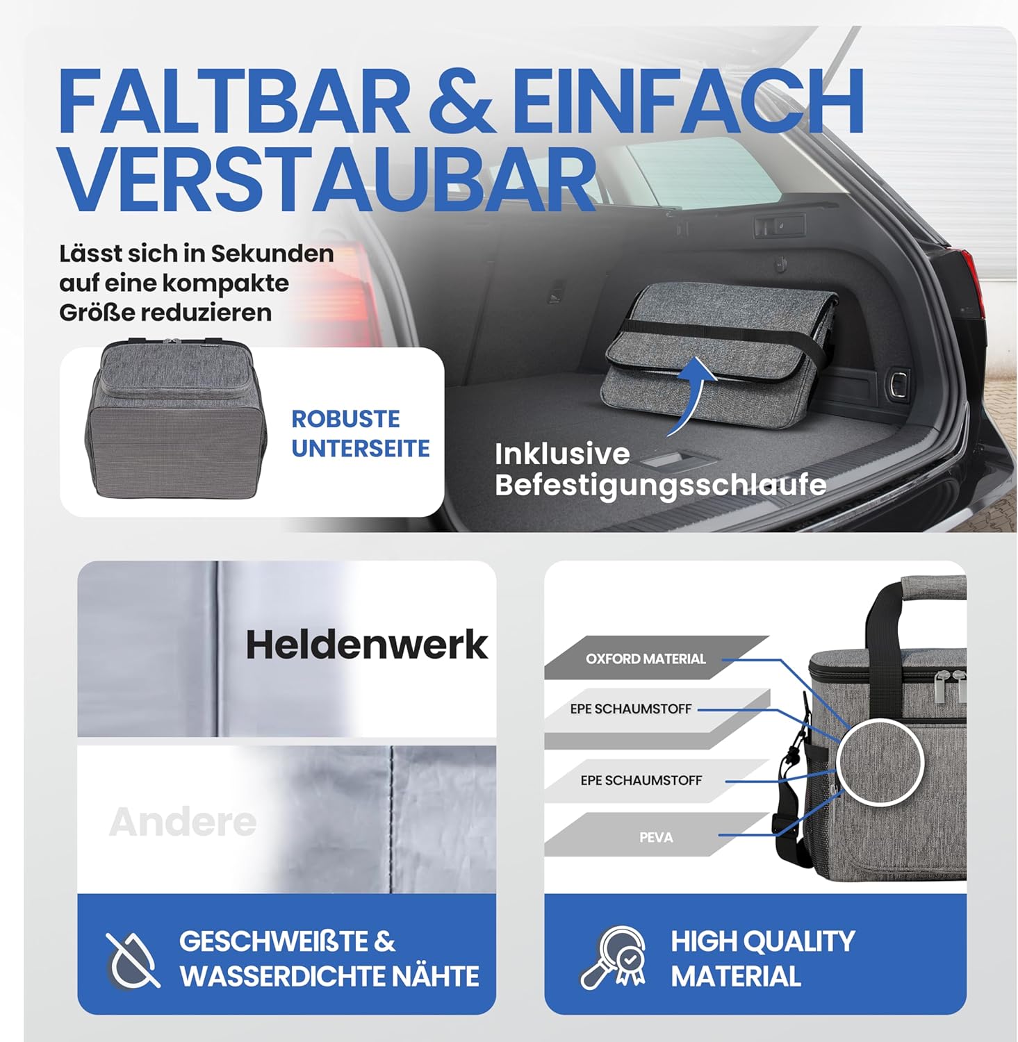 Die Heldenwerk Kühltasche in elegantem Dunkelgrau verbindet Funktion mit Design. Mit einer Kapazität von 30 Litern bietet sie ausreichend Platz für Lebensmittel und Getränke, während das robuste, wasserdichte Oxford-Gewebe und die fortschrittliche EPE-Thermo-Isolierung eine konstante Temperatur von 6 bis 8 Stunden sicherstellen. Der doppelte Reissverschluss, die geschweissten Nähte und die auslaufsichere Konstruktion gewährleisten eine zuverlässige Handhabung. Der gepolsterte Griff, der Tragegurt und die Möglichkeit, die Kühltasche zu falten erleichtern den Transport. Ein integrierter Flaschenöffner und die leicht zu reinigende Struktur steigern den Gebrauchskomfort. Zusätzlichen Stauraum bieten vier Seitentaschen und eine innere Netztasche.