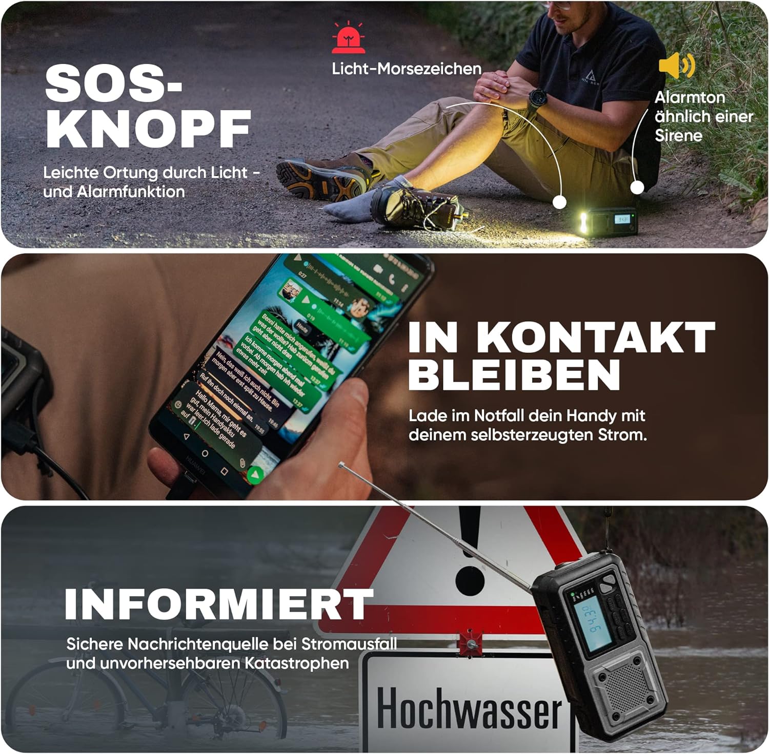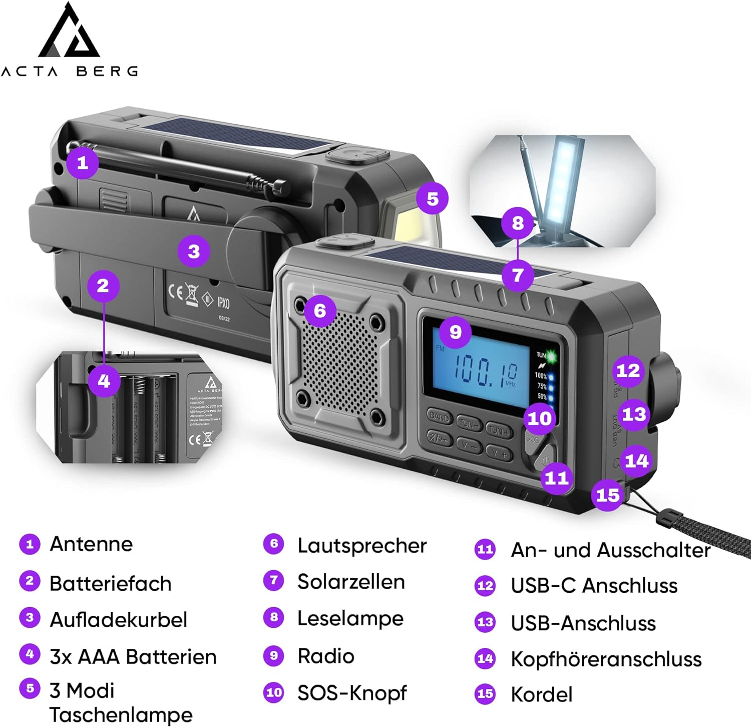 Das Acta Berg Kurbelradio präsentiert sich als robuste Notfallausrüstung, konzipiert für Zuverlässigkeit in anspruchsvollen Situationen. Das vielseitige Gerät, ausgestattet mit AM/FM/SW-Funkfrequenzen, bietet nicht nur Informationszugang bei Stromausfällen, sondern dient auch als praktisches Ladegerät dank des leistungsstarken 5000 mAh Akkus. Die integrierte Handkurbel und die Solarzellen ermöglichen eine flexible Stromversorgung mithilfe der Fast Charging Technologie. Mit seiner Taschenlampenfunktion erleichtert das Radio die Orientierung in der Dunkelheit und minimiert die Stolpergefahr durch den Late-Lux Modus, während der Super High Lumen Modus beeindruckende Helligkeit erzeugt. Gefertigt aus hochwertigem ABS-Kunststoff, ist das 385 Gramm leichte, graue Radio, dessen Masse 19 x 7 x 11 cm betragen, ein verlässlicher Begleiter für alle Eventualitäten.