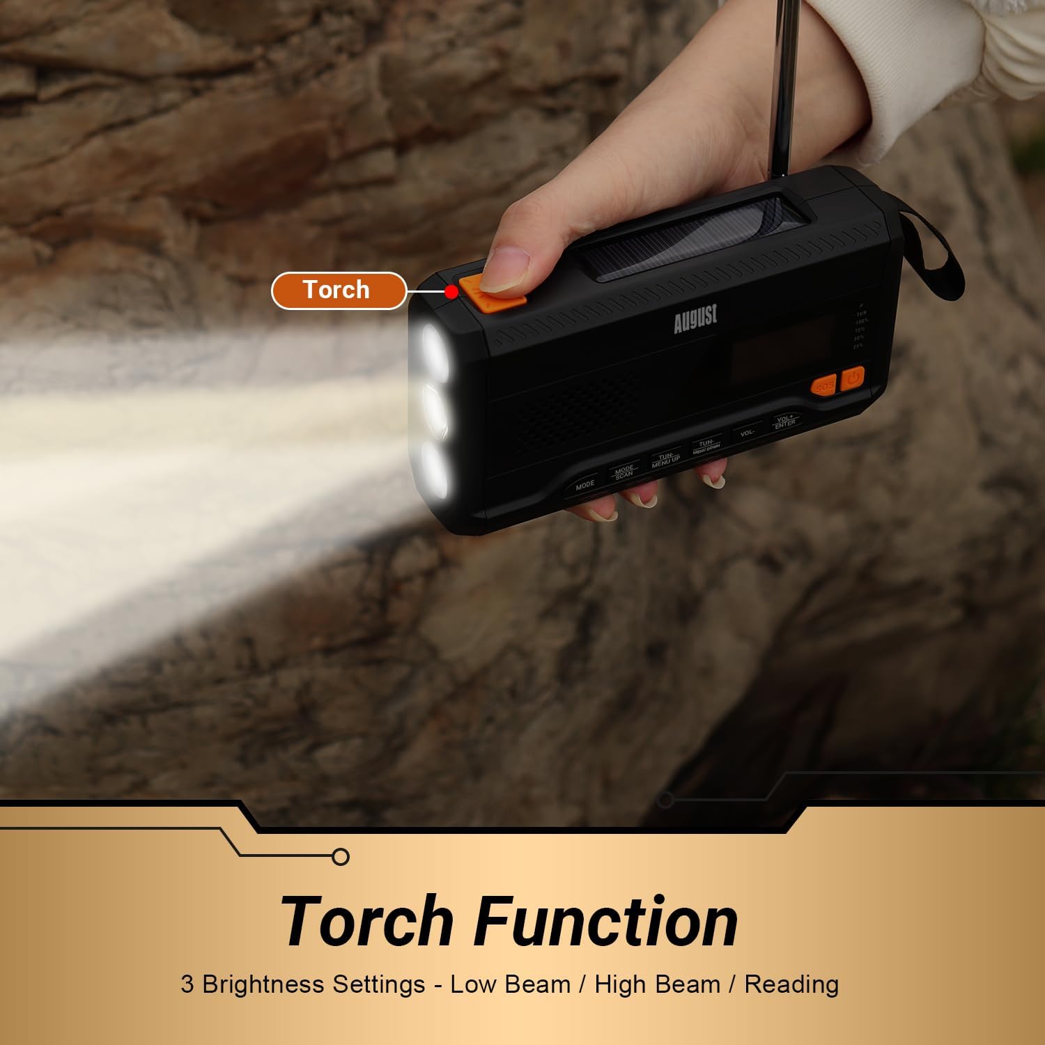Das August Kurbelradio MB290B ist ein multifunktionales Begleitgerät für Abenteuerlustige und Outdoor-Enthusiasten. Kompakt und leicht (300 g), lässt es sich problemlos in Taschen oder Rucksäcken verstauen und überzeugt mit den Massen von 15 x 7,5 x 4. Es vereint ein DAB/FM-Radio mit Bluetooth-Funktionalität und einem 3,5 mm Audioausgang, sodass sowohl der Empfang aktueller Nachrichtensendungen als auch das Abspielen eigener Musiksammlungen möglich ist. Die LED-Taschenlampe bietet mit drei Helligkeitsstufen und einer SOS-Alarmfunktion Sicherheit in Dunkelheit und Notfällen. Eine weitere Besonderheit ist das 4500mAh starke Powerbank-Feature, welches mittels Kurbel- und Solarenergie aufgeladen werden kann und somit ein unabhängiges Aufladen von Geräten ermöglicht. Bis zu zwei Stunden Geräteladung oder etwa 60 Stunden Musikgenuss stehen zur Verfügung, wenn der Akku vollständig geladen ist.