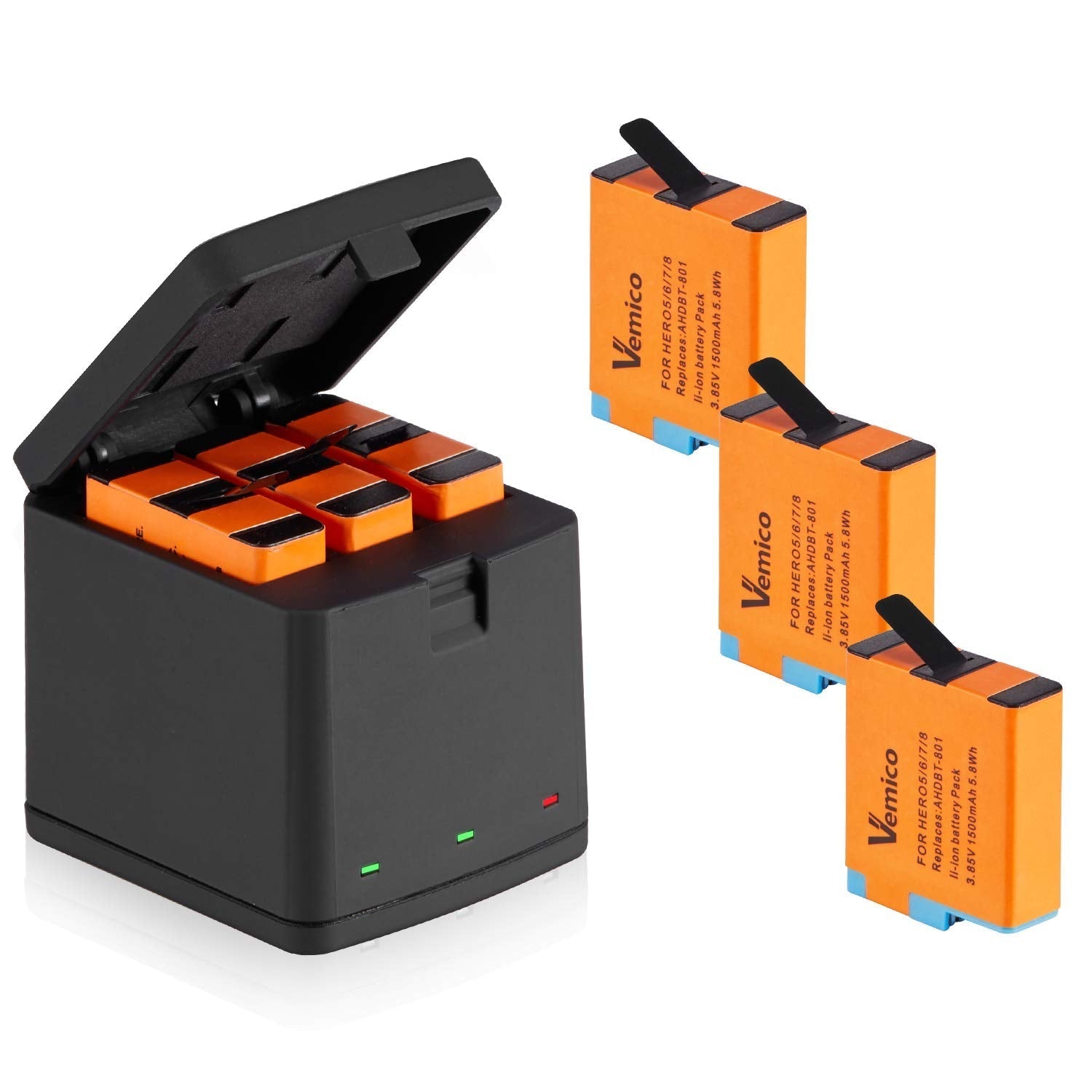 Das Set besteht aus einem Akkuladegerät, welches schnelles Laden unterstützt und mit dem drei Akkus gleichzeitig und unabhängig voneinander geladen werden können. Die drei mitgelieferten Li-Ionen-Akkus besitzen eine Kapazität von 1500 mAh und sind kompatibel mit Gopro Hero 8, Hero 7 Black, Go Pro Hero 6 Black, Go Pro Hero 5 Black und Hero 2018. Das Ladegerät besitzt einen Deckel zum Schutz der Akkus und kann somit auch leicht transportiert werden. Es verfügt über einen 5V 2.1A Eingang und drei 4,4 V 700 mA Ausgänge. Des Weiteren befindet sich ein USB-C-Kabel im Lieferumfang.