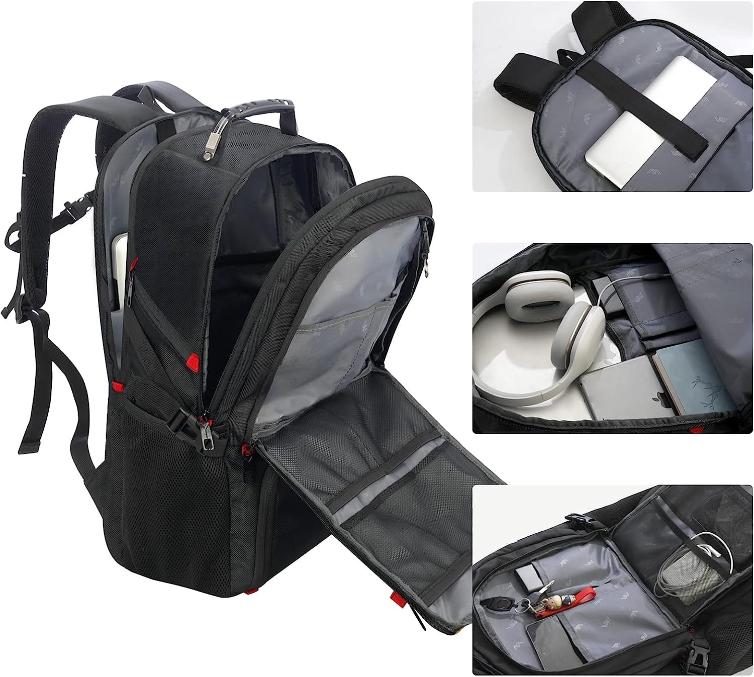 Der Rucksack besteht aus wasserabweisendem Stoff. Das macht ihn widerstandsfähig gegen Risse und Kratzer. Die atmungsaktiven Netzpolster an den Schultergurten sorgen für einen angenehmen Tragekomfort. Mit einem Fassungsvermögen von 45 Litern bietet der Rucksack ausreichend Platz. Er verfügt über ein separates Laptopfach (Laptops bis 18.4 Zoll) mit fünflagigem Schutzschwamm, das Hauptfach bietet Platz für Bücher, A4-Ordner und Kleidung, während die zwei Fronttaschen und die Seitentaschen Platz für kleinere Dinge wie Handy, Schlüssel, Regenschirm oder Wasserflasche bieten. Die Seitentaschen haben Schnallenriemen, um längere Gegenstände sicher zu halten, während reflektierende Streifen auf den Schultergurten für bessere Sichtbarkeit sorgen. Ein Brustgurt entlastet den Rücken und ermöglicht ein bequemes Tragen. In der Fronttasche befindet sich ein Haken, an dem Gegenstände aufgehängt werden können. Der Rucksack bietet einen externen USB-Ladeanschluss, über den elektronischen Geräte unterwegs aufgeladen werden können. Die Gepäckgurte ermöglichen es, den Rucksack an einem Koffer zu befestigen und so zu transportieren. Eine Anti-Diebstahl-Tasche auf der Rückseite schützt Wertsachen vor unerwünschtem Zugriff. Ein besonderes Merkmal des Rucksacks ist das Deformationsdesign. Wenn Schuhe oder Kleidung im separaten Schuhfach aufbewahrt werden, wird der Hauptfachbereich verkleinert, um mehr Platz für das Schuhfach zu bieten. Die untere Tasche kann auch gefaltet werden.