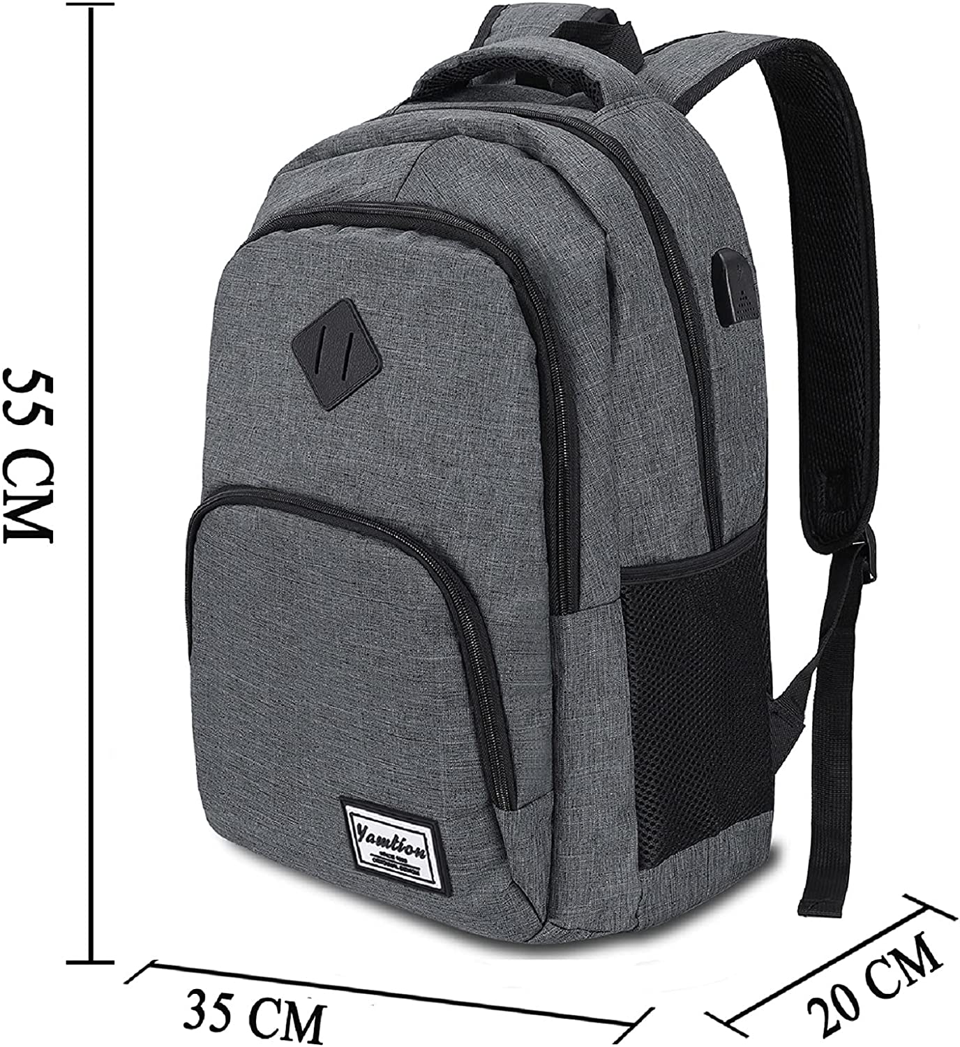 Der Rucksack verfügt über drei Hauptfächer, ein Laptopfach und zwei Seitentaschen. Das Fassungsvermögen beträgt 40 Liter. Er ist aus wasserabweisendem 600D Oxford-Stoff gefertigt und bietet einen integrierten USB-Anschluss zum bequemen Aufladen von Smartphones. Der Rucksack ist mit einer dicken, atmungsaktiven Polsterung und ergonomischen, verstellbaren Schultergurten ausgestattet, die für hohen Tragekomfort sorgen. Mit seinem schicken Design ist er Unisex. Der Rucksack bietet ausreichend Platz für einen 17.3-Zoll-Laptop sowie weitere Gegenstände wie Bücher, Kleidung, Zeitschriften, Wasserflasche und Regenschirm. Er hat die Masse 55 x 35 x 20 cm. Im Lieferumfang enthalten sind der Rucksack und ein USB-Kabel.